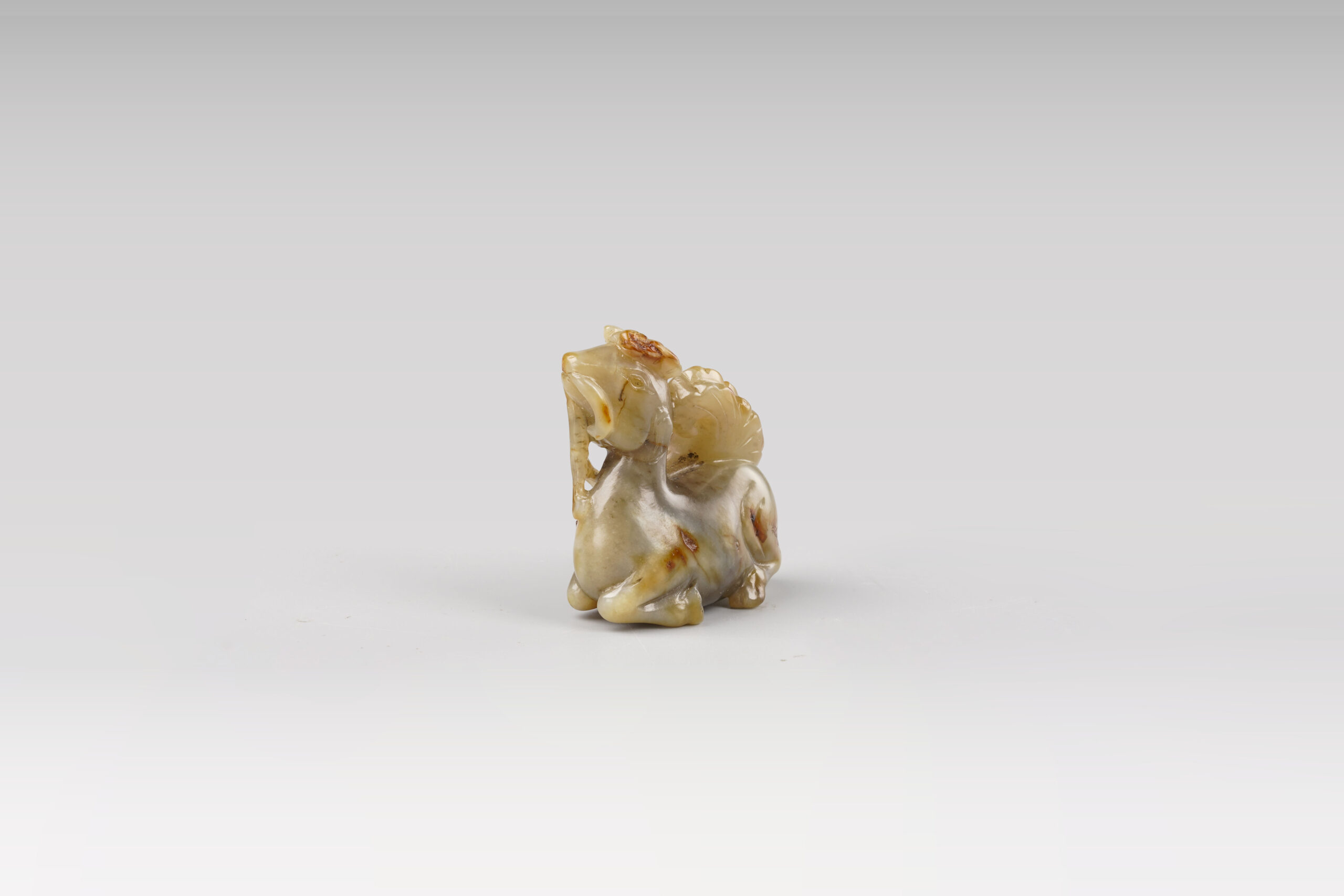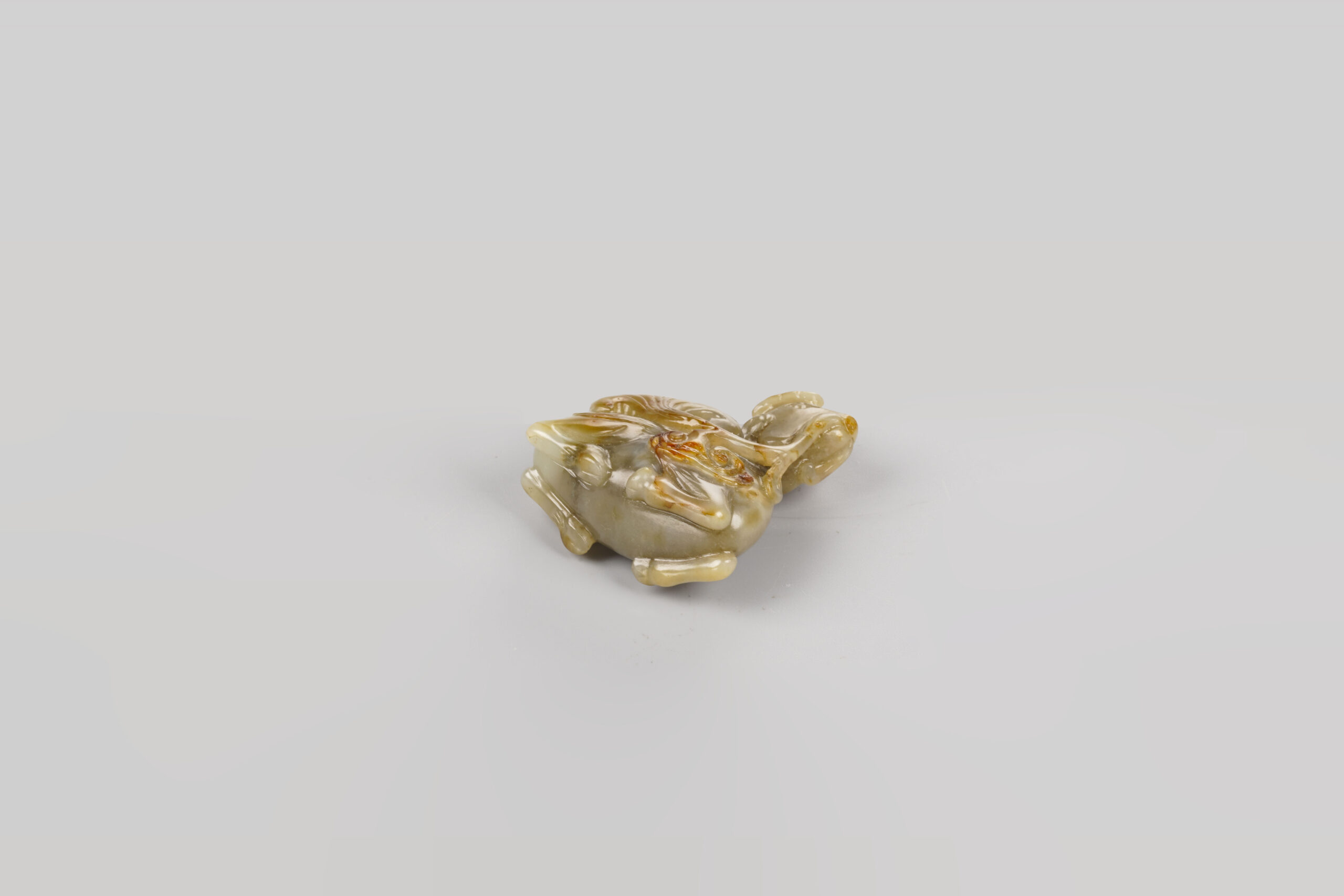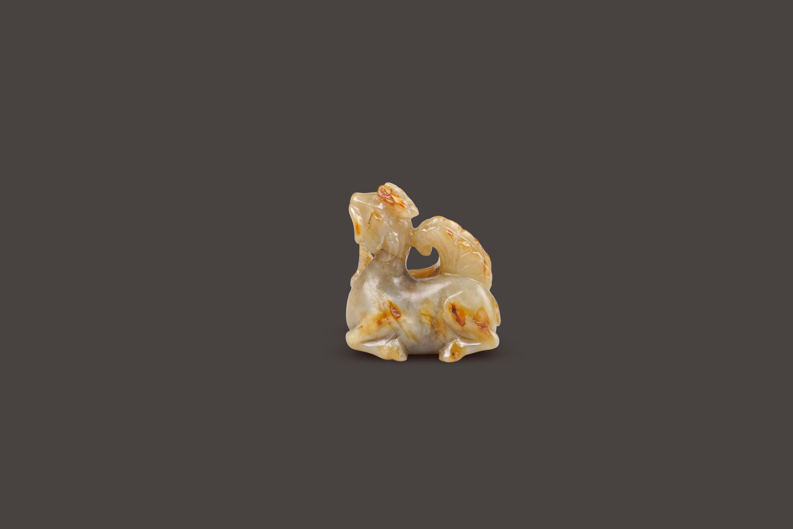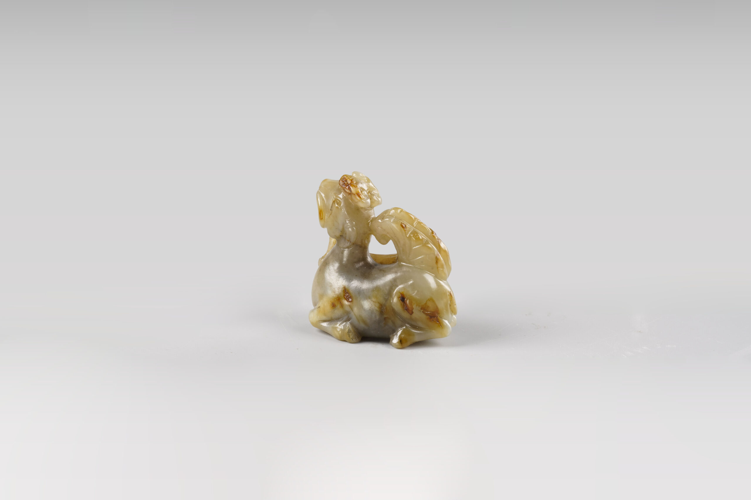 中國文化中,鹿為長壽代表,與「祿」諧音,表「長壽」或「繁榮昌盛」,亦有「加官受祿」之吉祥寓意。本件白玉質,器身受沁帶皮,色彩斑斕,質地潤澤。圓雕鹿銜靈芝,著鹿頭頂如意雙角,一對杏核眼炯炯有神,雙耳下垂,小巧口鼻銜著靈芝,自信滿滿,昂首跪臥於地。其身型圓潤,短尾上揚,造型比例勻稱。所銜靈芝為工匠就玉皮巧雕,線條流暢,恰為點睛之處。此件小巧,精神十足,寓意吉祥,難能可貴。