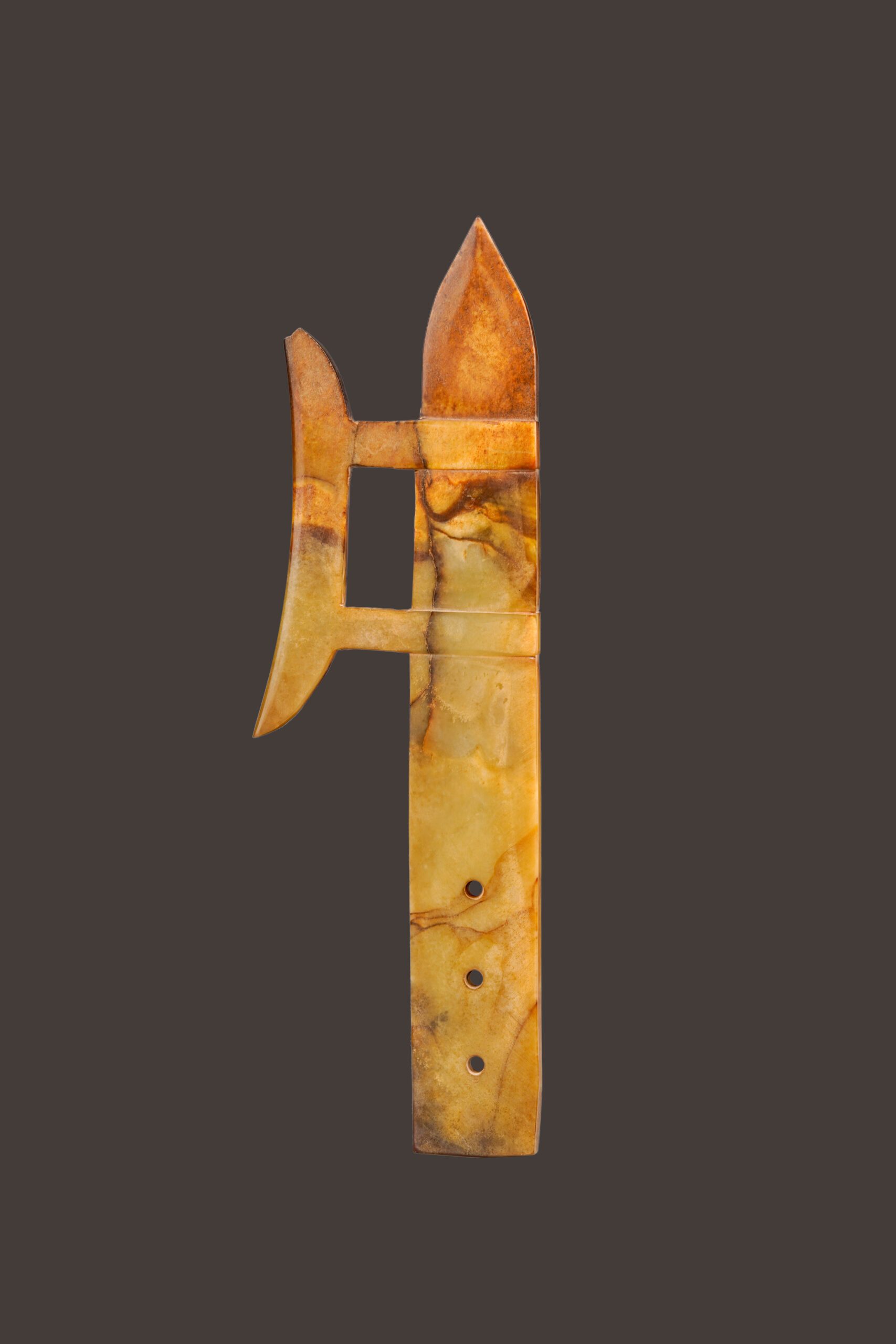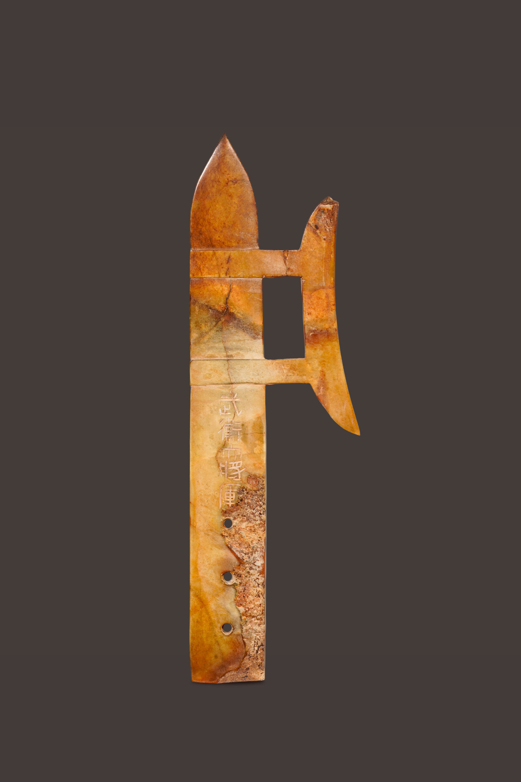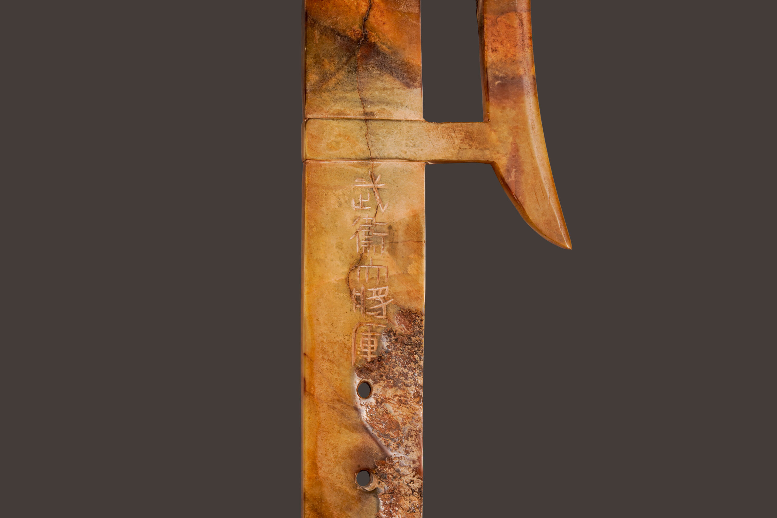 戟為古代長兵器,是戈與矛的合體,前端側邊裝設一道月牙形利刃。古今最為人所知者,莫過於三國演義中描述,猛將呂布所持的「方天畫戟」。本件以良玉為材,琢為玉戟。器身如矛,前端側邊以鏤雕、浮雕琢月牙型,型如裝設於矛前端一般。下端琢三穿孔,應為將器身固定在木竿上,穿過柱狀物或縛繩固定之用。一面刻有「武衛大將軍」五字,字體工整有力。整器拋光平整,下端帶沁,包漿溫潤凝厚,器型規整有致。武衛大將軍一職始於北魏,依器身文字推測,應為大將軍出行之儀仗用玉兵器。