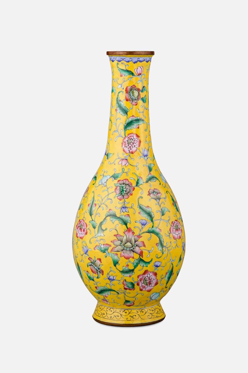 清中期 銅胎畫琺瑯黃地纏枝花卉紋瓶