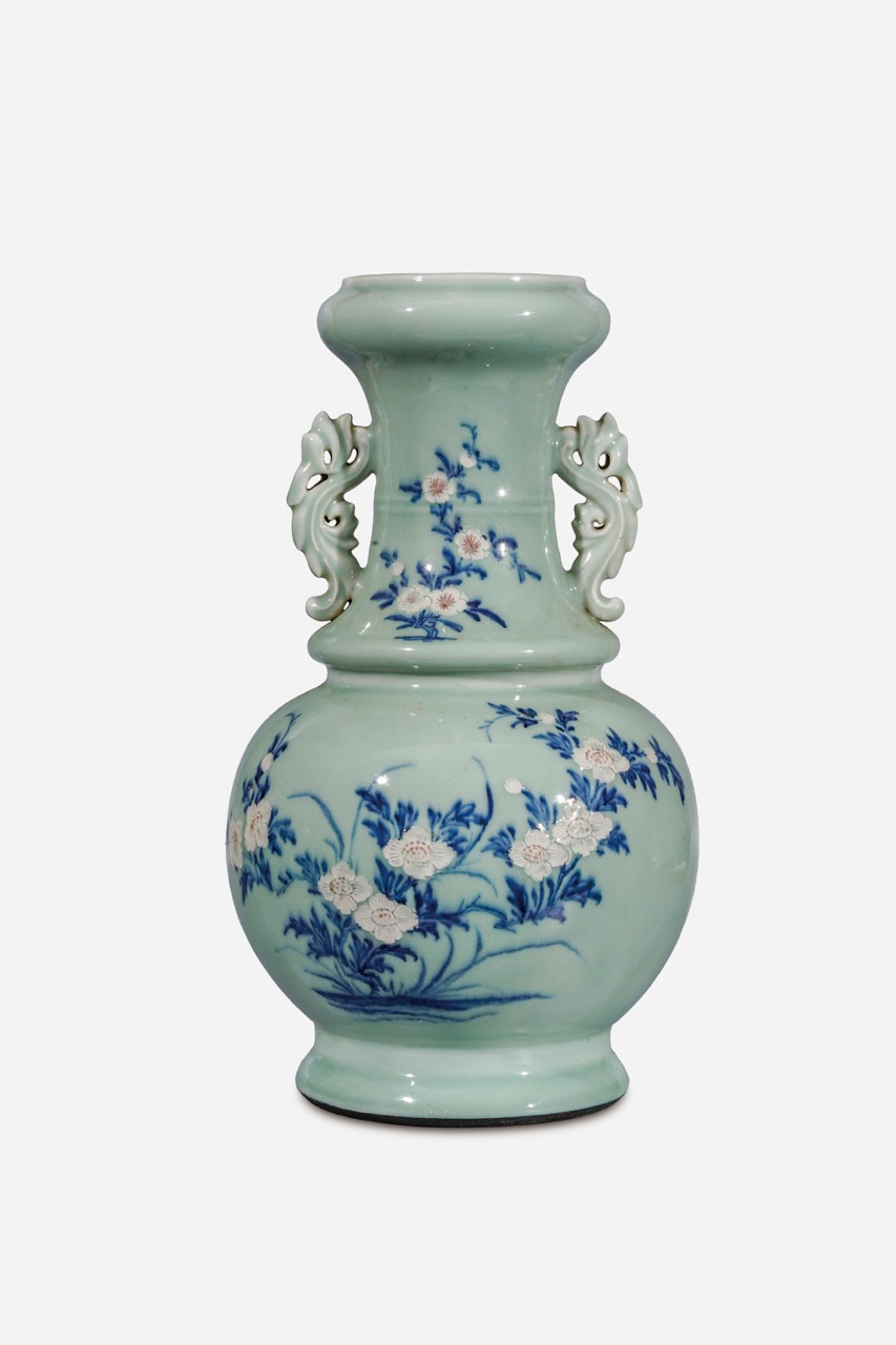 清中期 豆青青花釉里紅花卉紋蒜頭瓶