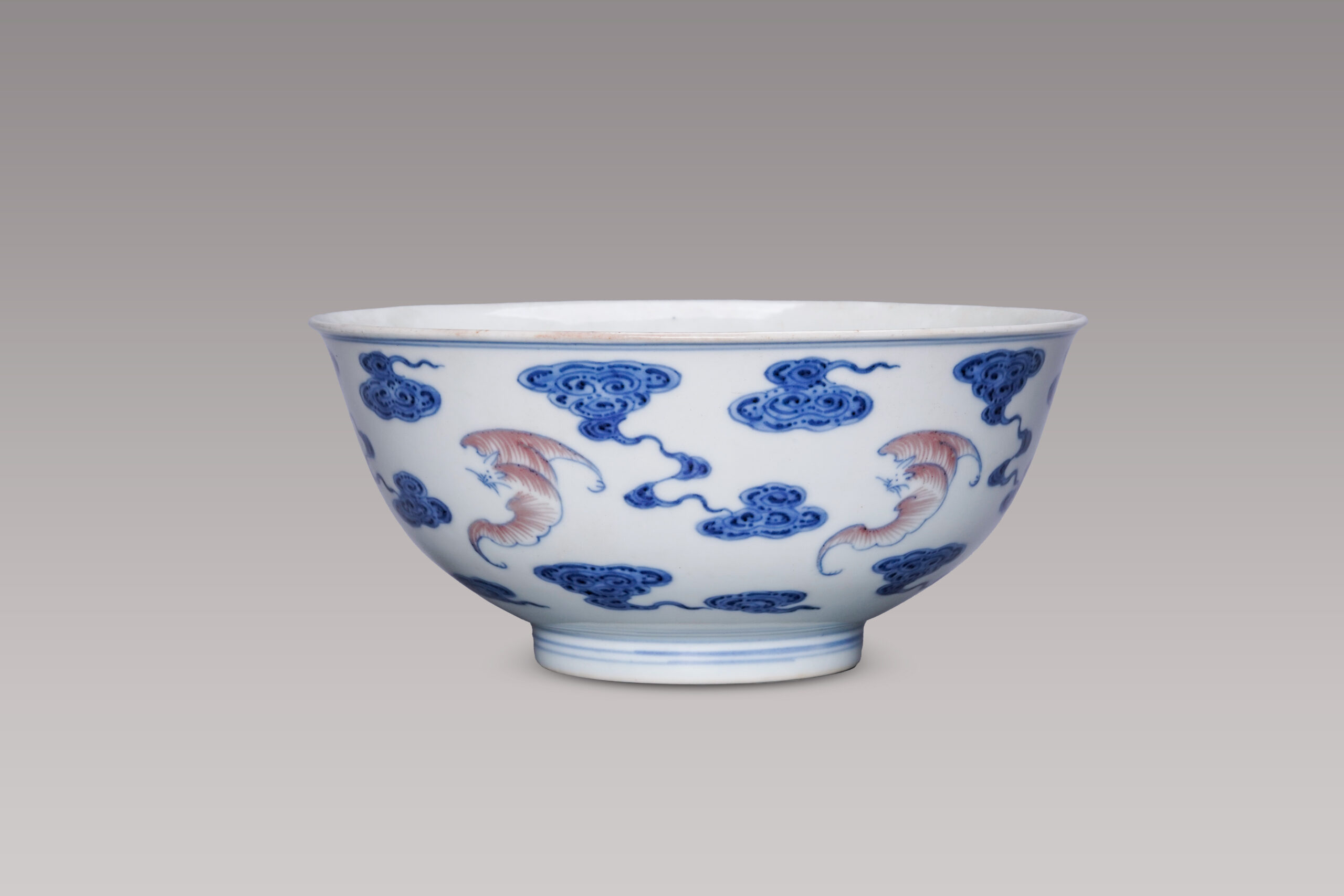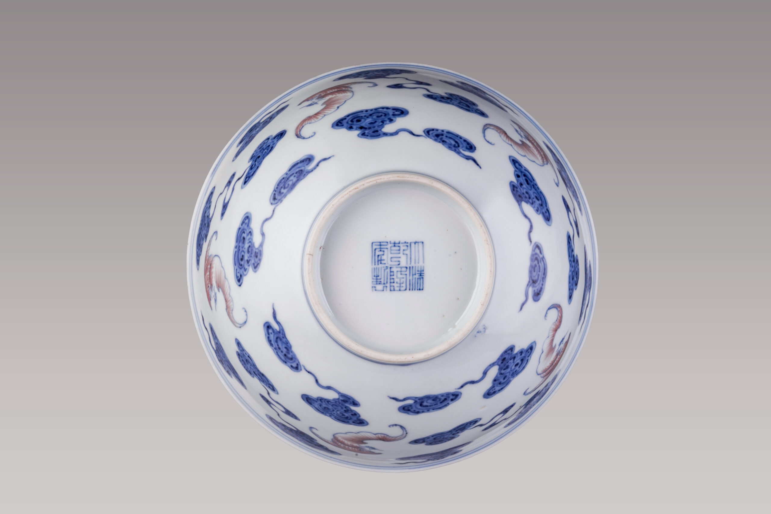 青花釉裡紅約於元代創燒,由於青花與釉裡紅燒造溫度有差異,燒製合格品難度甚高,極為名貴。本件做器敞口,弧腹,圈足,器型大而規整。通體施白釉,外壁以青花繪祥雲紋,五福展翅飛翔於祥雲間,寓意「五福臨門」。蝙蝠以青花描邊,釉裡紅繪線條表現蝙蝠身體曲線。青花發色穠艷富層次,釉裡紅色澤勻稱,紋飾線條俐落流暢,底足修胎圓潤規整,器底書「大清乾隆年制」六字二行篆款,字體平穩嚴謹,處處可見官窯器之規矩與用心。