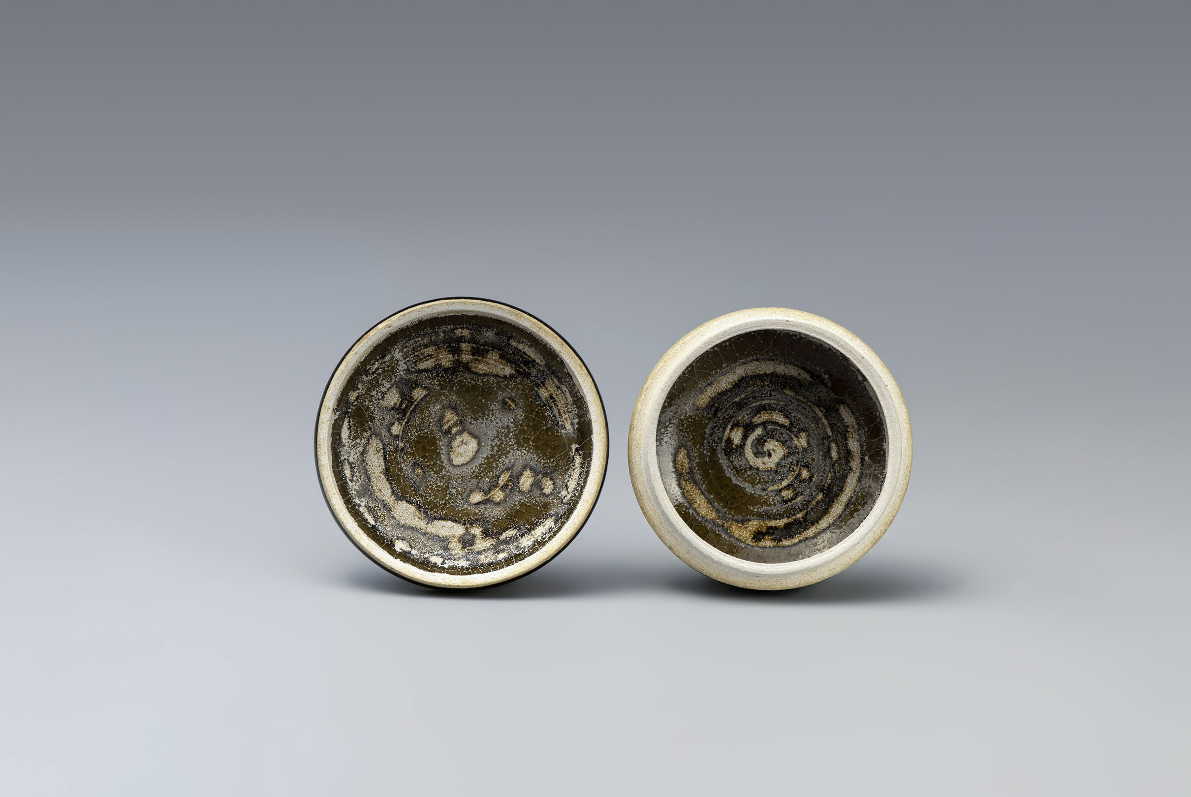 此對香盒器型規整,子母口。胎土色白帶黃。盒蓋蓋面膨起,做弦紋開光,中央施白釉繪蝶紋。盒蓋器表施釉,釉層溫潤肥厚,蓋沿裸胎,蓋內施釉較薄。盒身直腹下收,平底。口沿及器腹以下裸胎,僅器腹施釉,流釉垂墜成自然漸層。盒內淺刷一層薄釉,釉面螺旋狀應為工匠刷釉痕跡,恰成裝飾。這對香盒小巧精緻,質樸素雅,可為印盒,亦可作香盒使用,格外別緻。