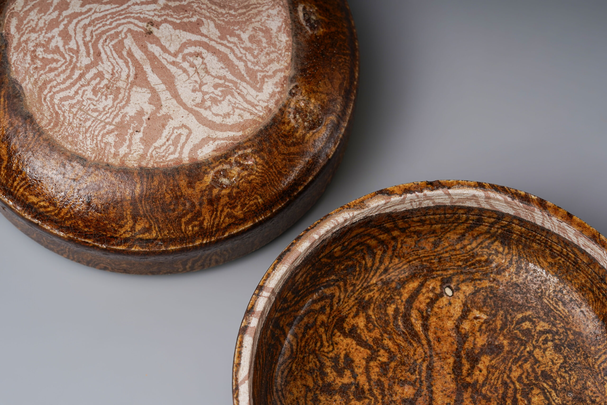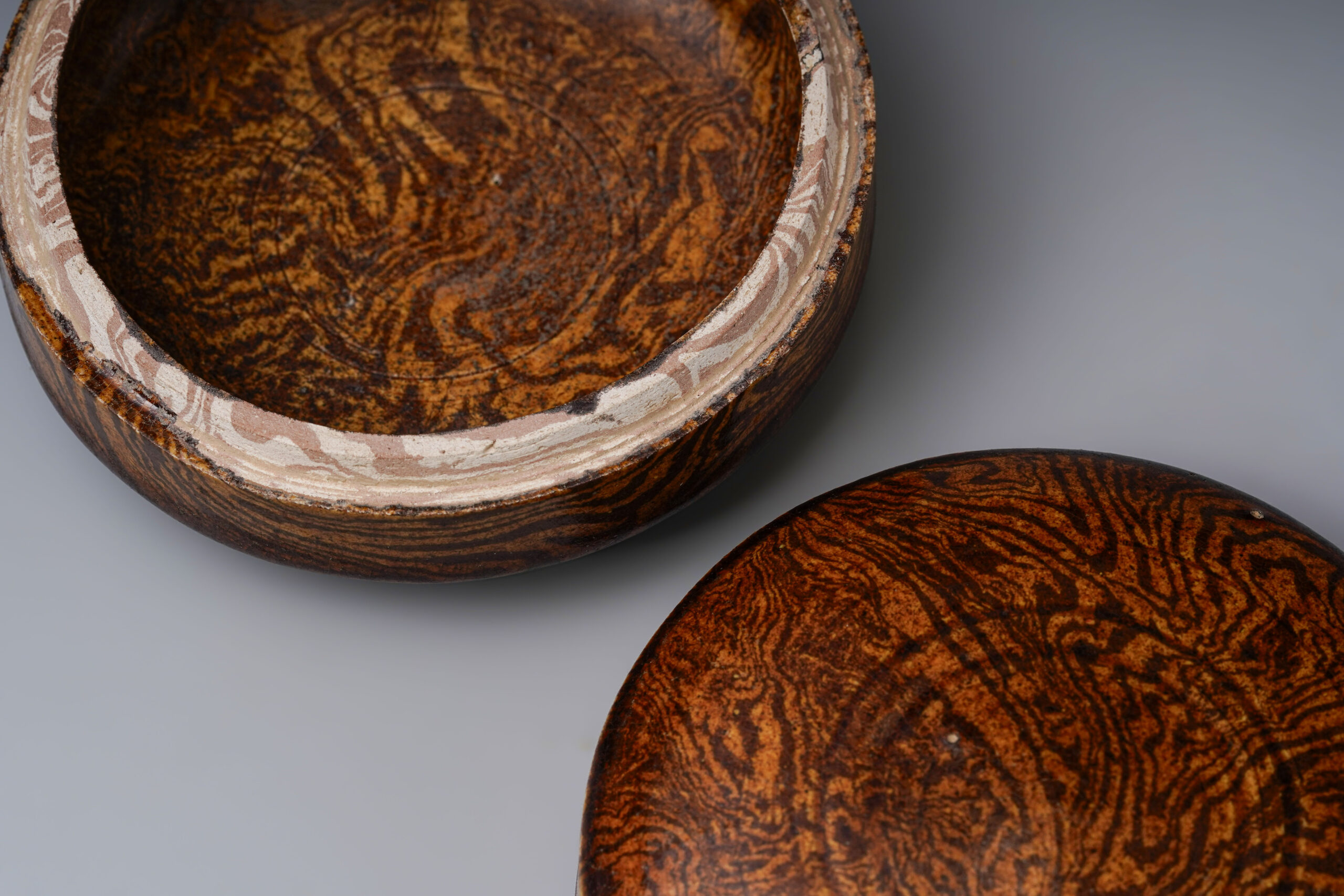 本件瓷器以絞胎法製瓷胎,做帶蓋圓香盒,器身扁圓,直腹,子母口,腹下收斂做平底。盒蓋蓋面鼓起,蓋面中央以陰線刻畫兩道弦紋。器身施透明釉,器表成黃褐色,盒蓋折沿處及弦紋積釉成深褐色。透明釉下透出線條如木紋般的絞胎紋理,優美自然。盒蓋及盒身絞胎線條銜接流暢,恍若一體。整器器形規整,釉面觸感溫潤,經千年傳承,品項全美,尤為難得。