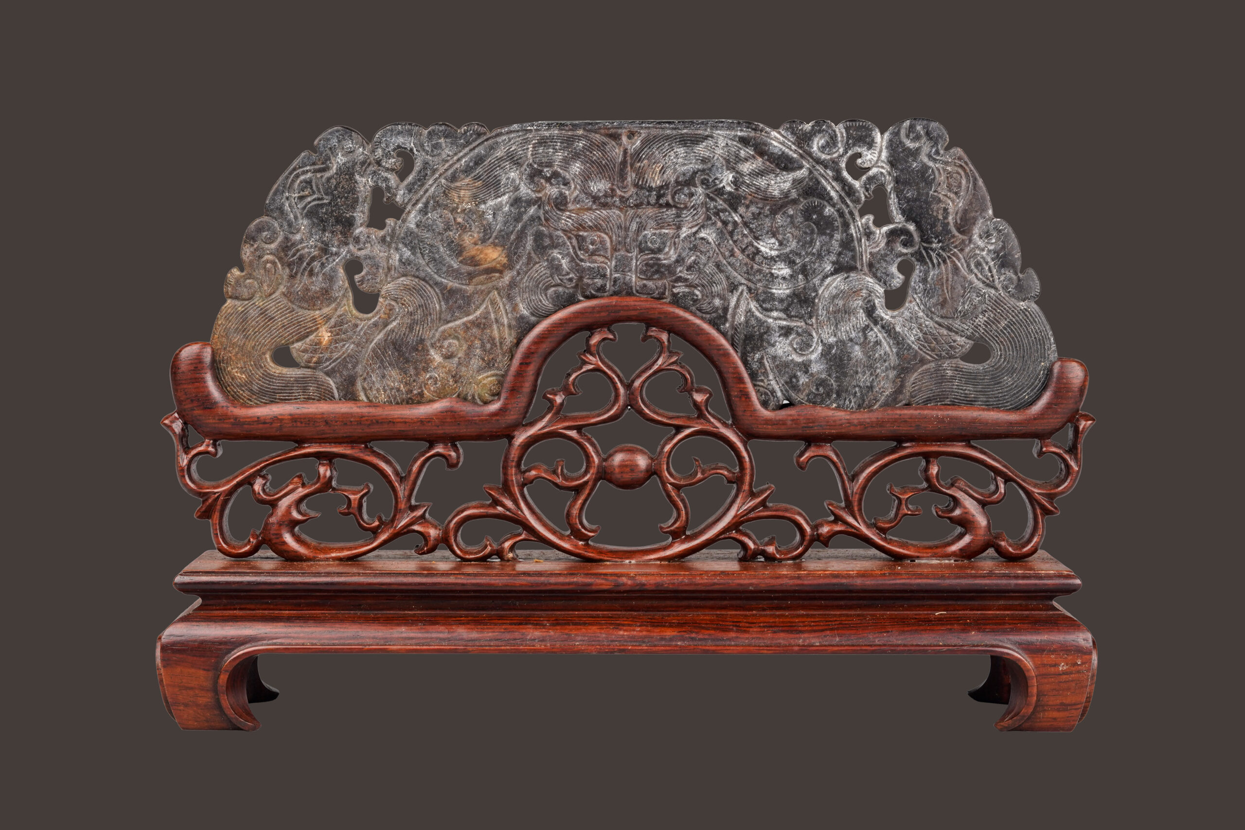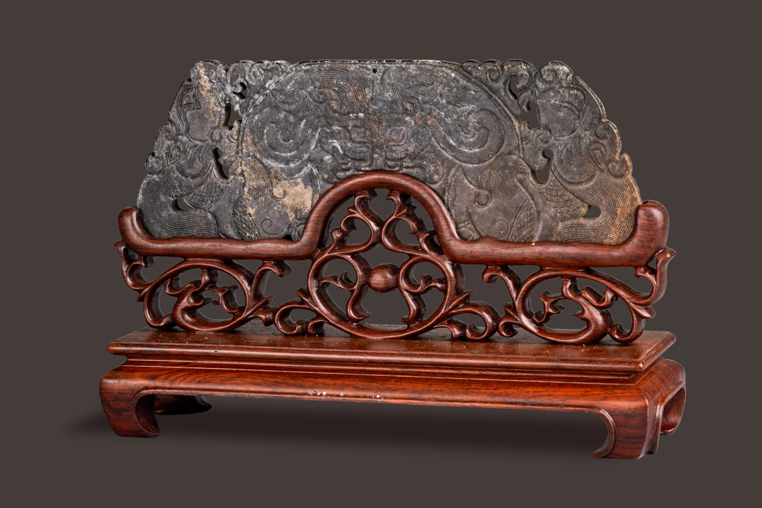 本件玉璜器型碩大,通體受沁,玉色黝黑深沉。兩面紋飾相同,左右雕雙龍首,中央刻一神獸面,三者均刻臣字眼,陰線刻畫細密流暢。中央神獸頂端琢一對穿孔,或為古代作為禮器組佩飾的繫繩處。本件氣質莊重沈穩,氣象森嚴,妝點空間沈穩肅穆,古意盎然。