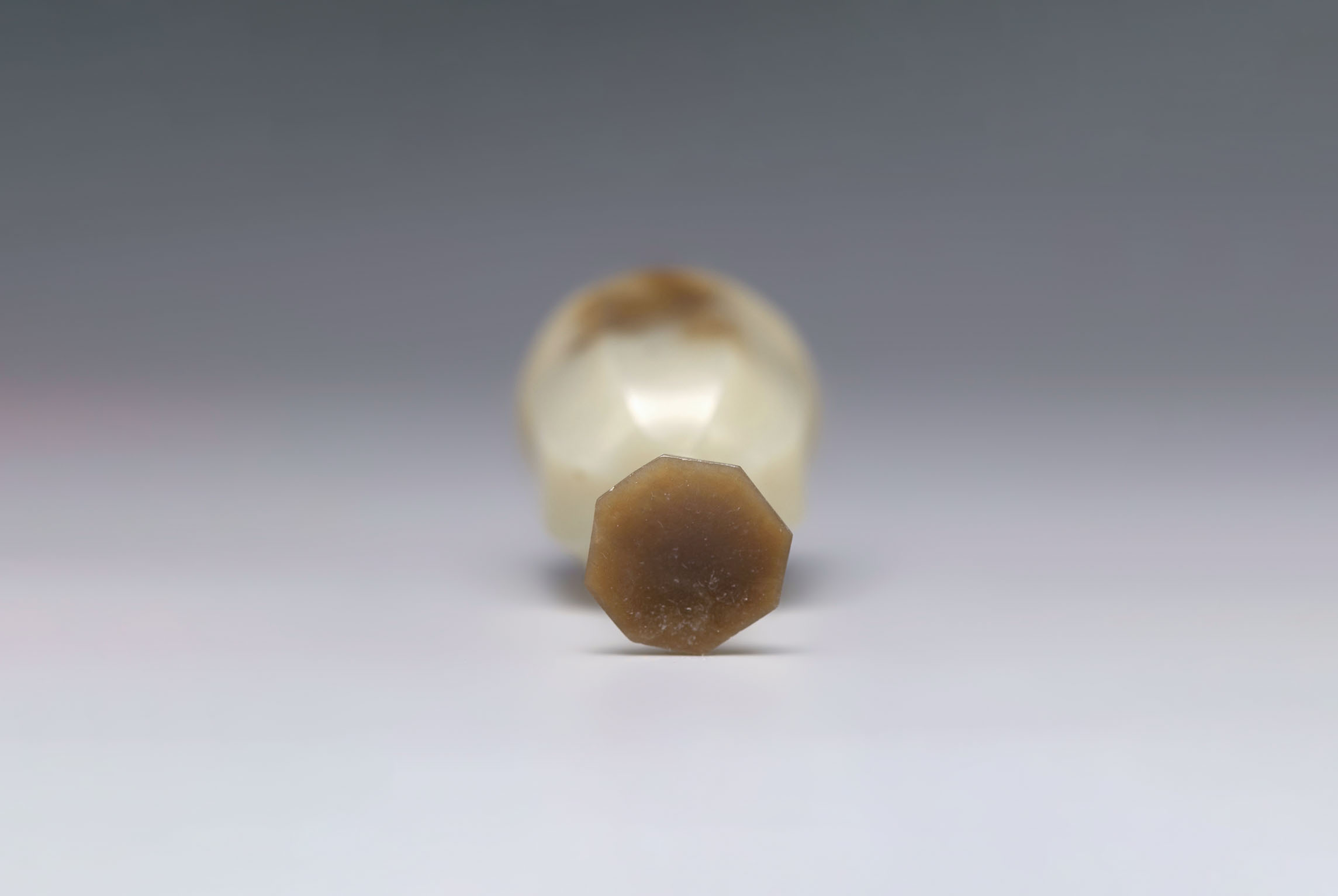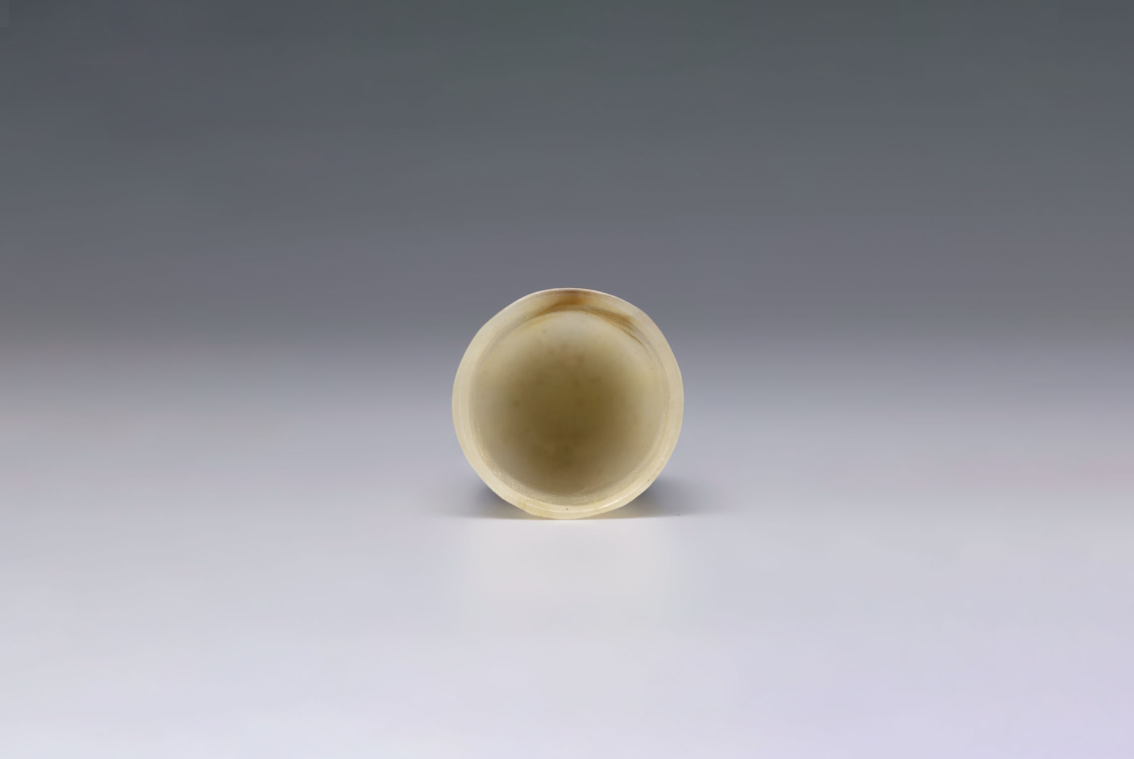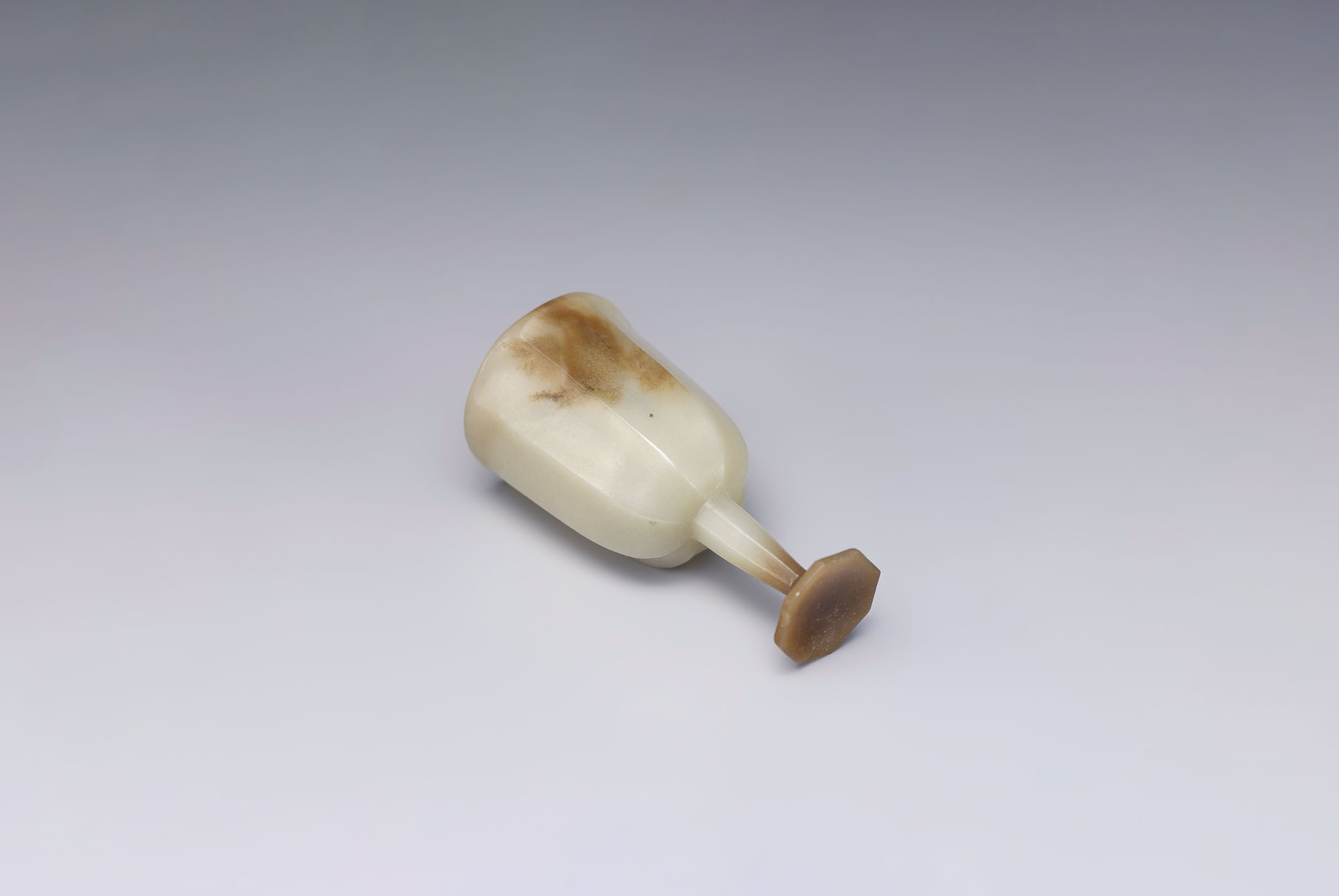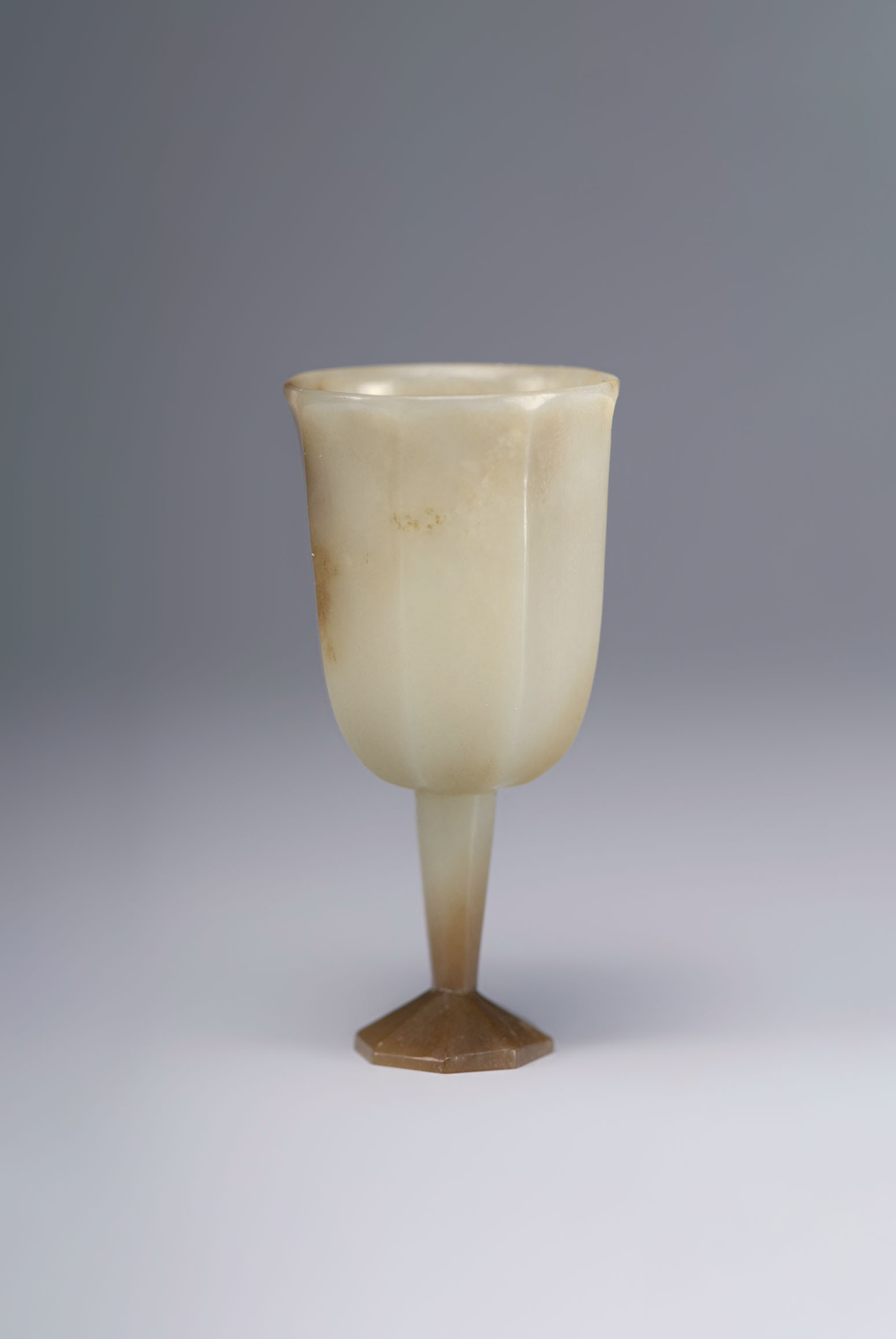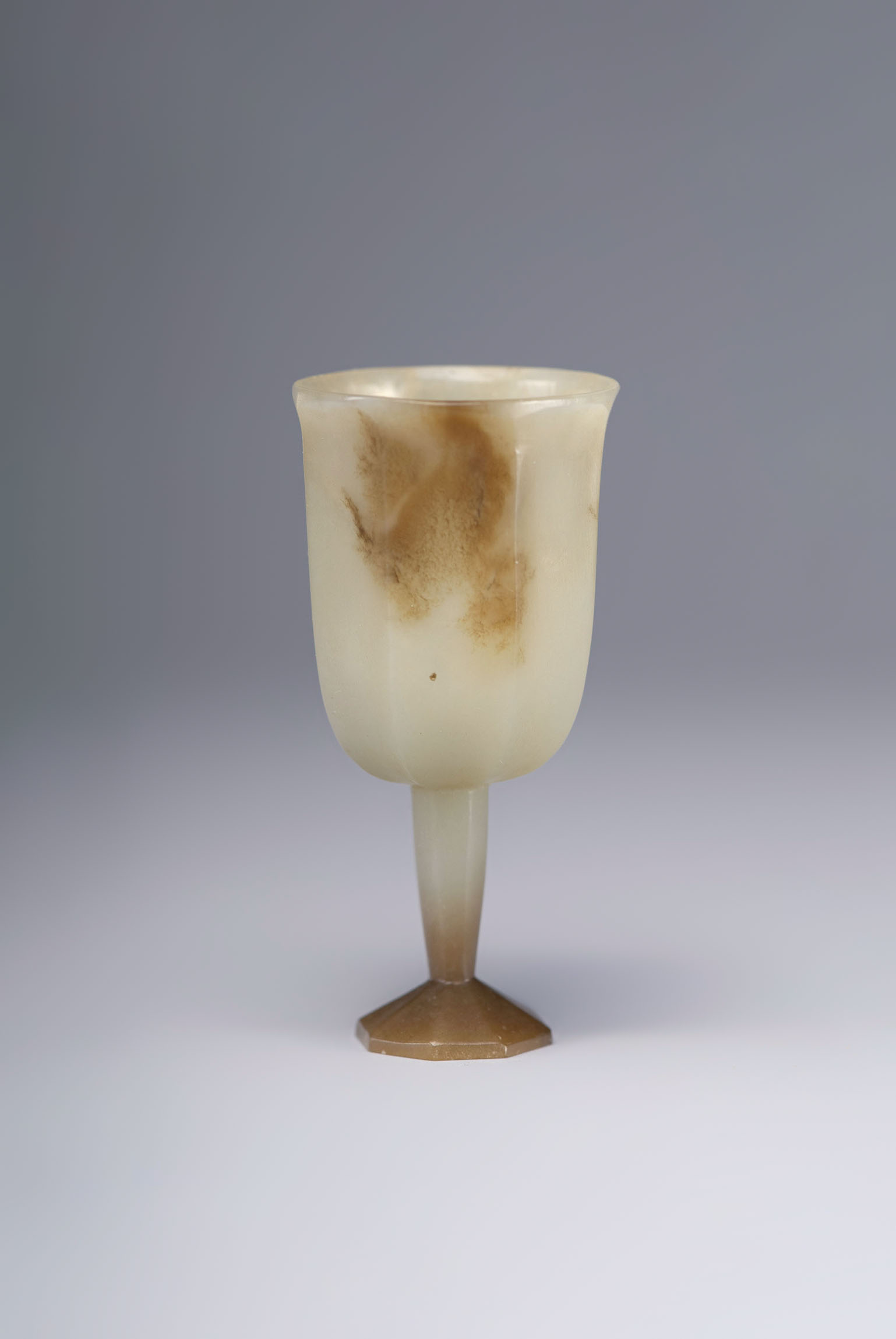 此杯玉質潤澤細密如凝脂,琢杯敞口,斜直璧,璧身八稜形,圓柱型高足,上寬下窄,底足亦琢為八稜。杯壁受糖色沁,狀如飛鳥。底足亦受糖色沁,恰如巧色。此杯器質俊秀雅緻,器身沁色恰如點綴,為難得佳器。