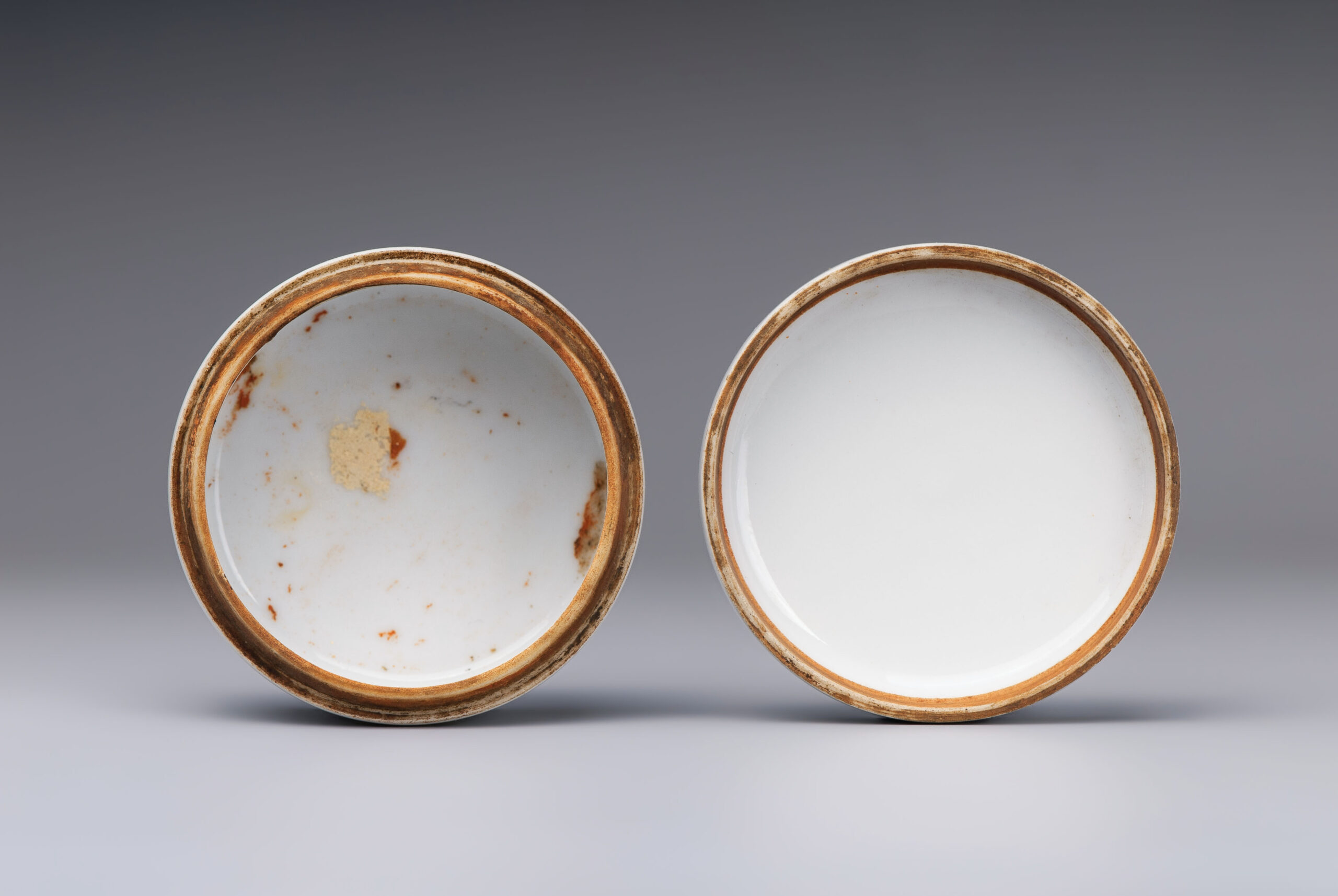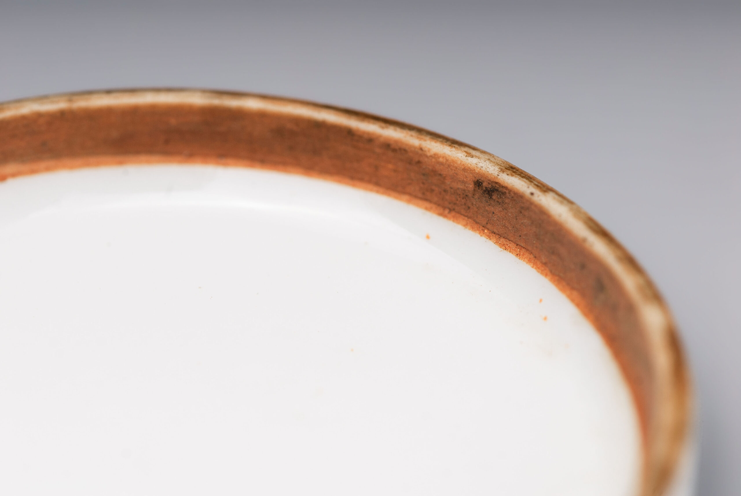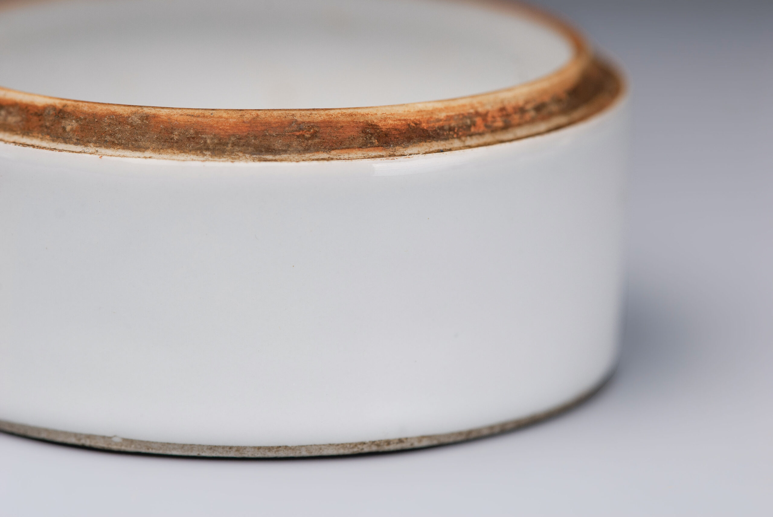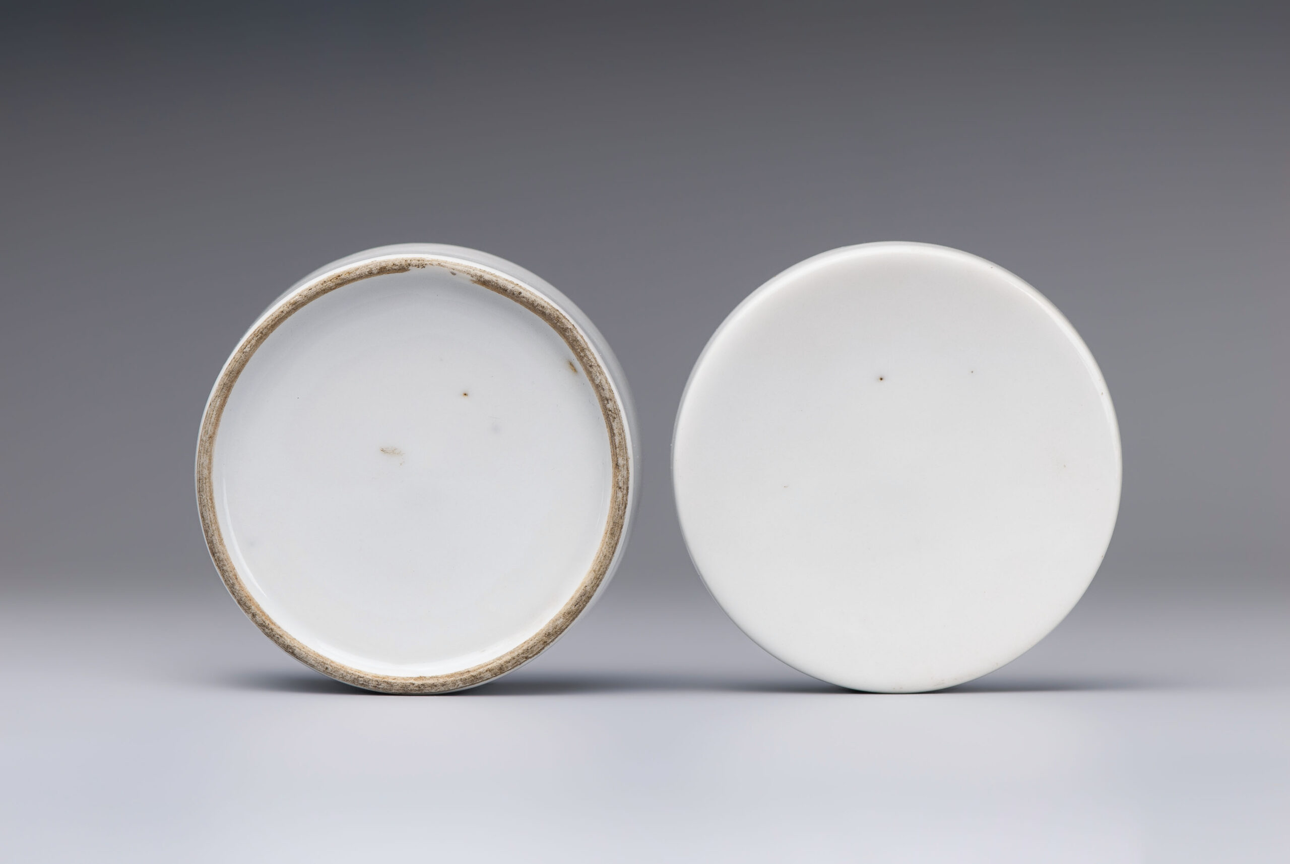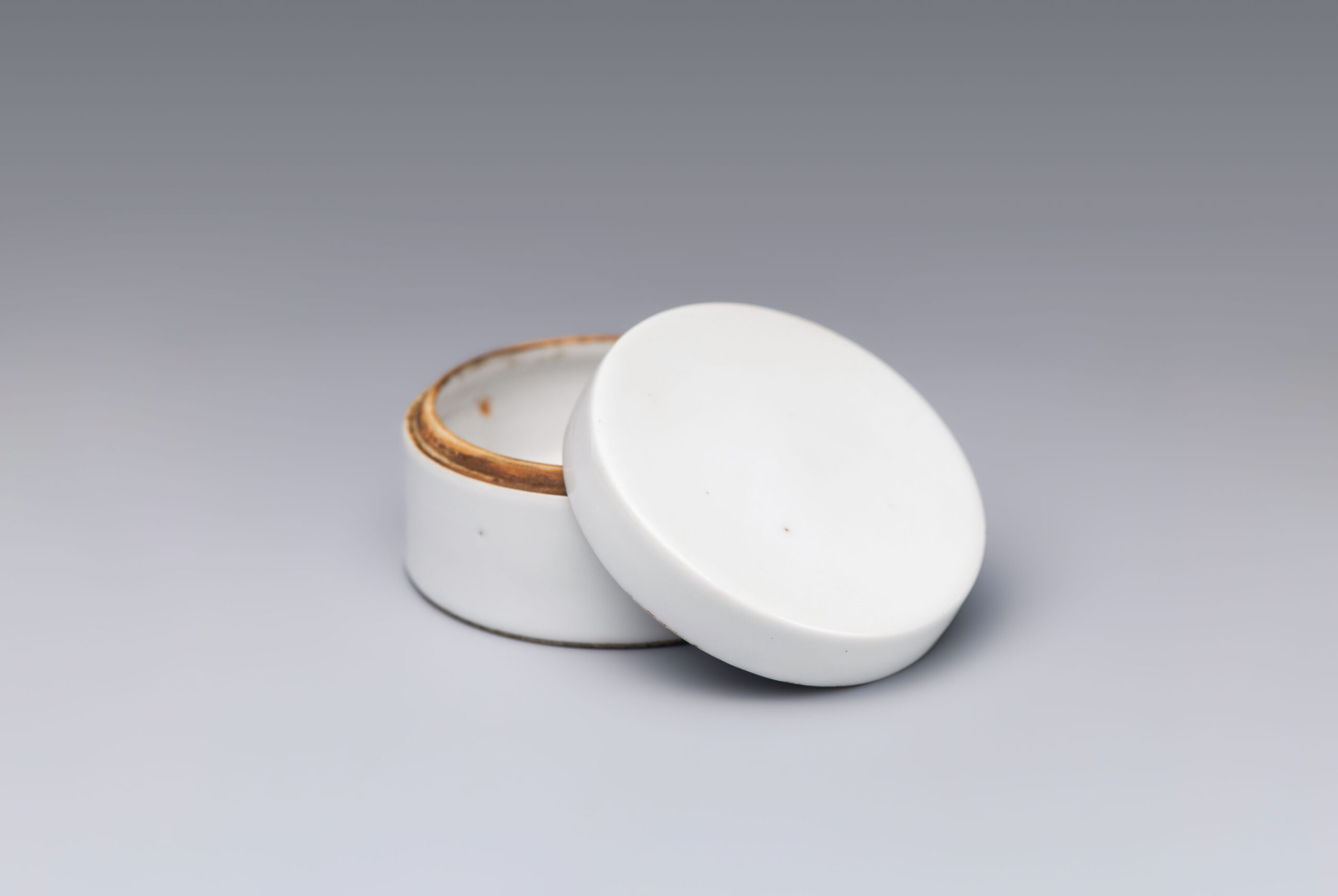 器做圓柱形帶蓋印盒,子母口。整器施白釉,瓷質緻密,釉光明亮滋潤。局部裸胎,見火石紅。器底做圈足,胎土細膩白皙。德化窯創燒於宋代,以白瓷與瓷塑聞名,有「牙白」之稱。此器素雅勻淨,光素無紋,氣質沉穩,為文房佳器之精品。