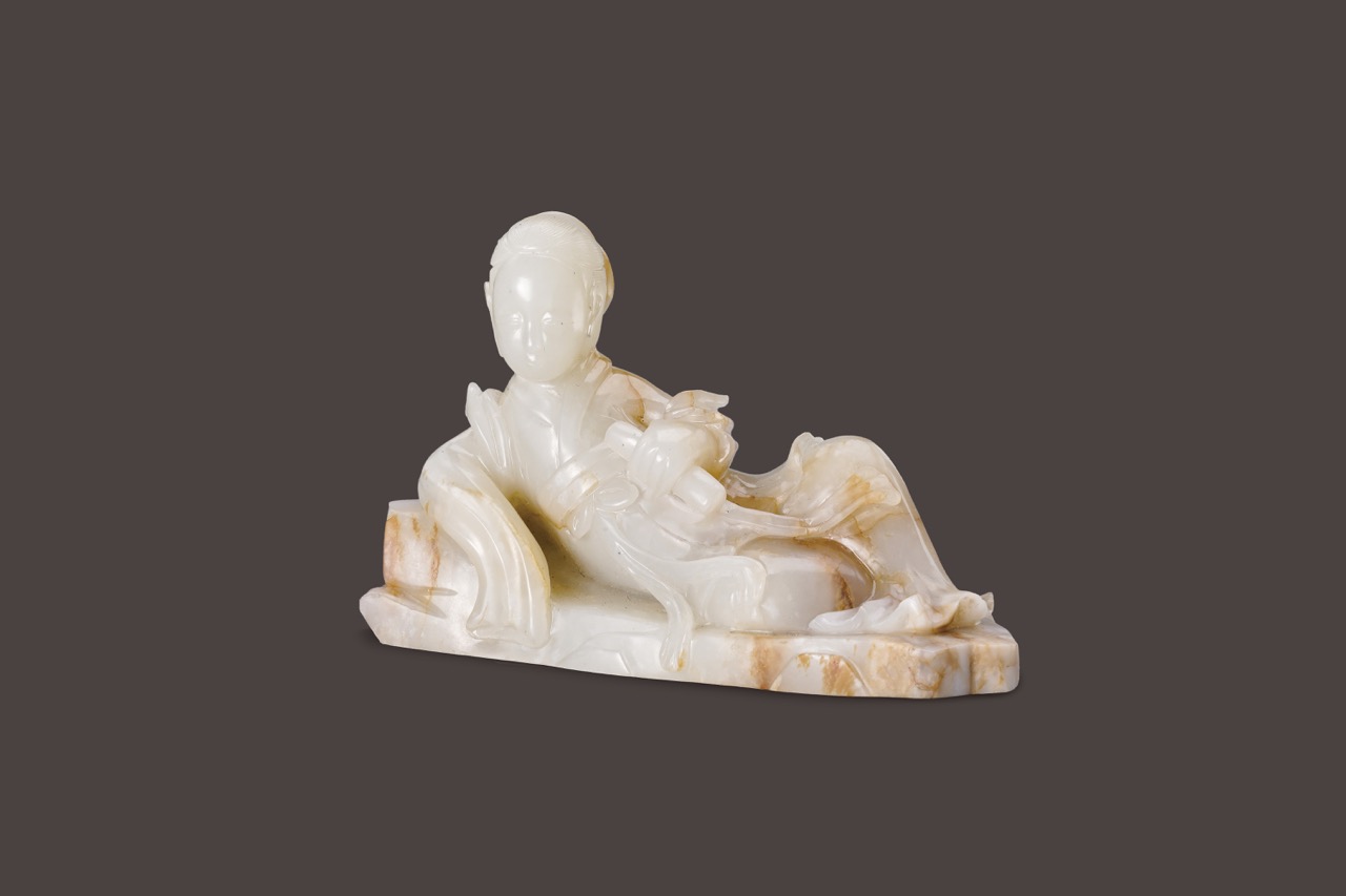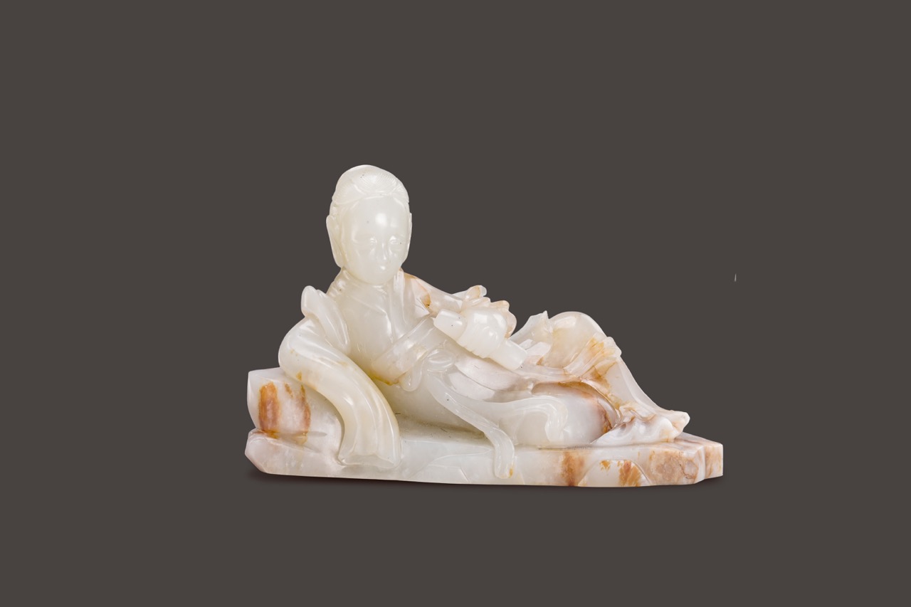 本件取瑩潤白玉為材,局部帶沁,圓雕仕女持經。仕女鵝蛋臉,頭梳單盤髻,雙眼微開,面帶笑容,一手倚靠岩石,一手持卷,側身躺坐於岩床上,衣袖、裙帶自然流洩,體態慵懶,婀娜多姿。其雕工圓熟,仕女髮絲細密流暢,衣袂表現柔順自然,仕女身形比例輕盈曼妙,表情姿態表現到位,讓觀者捨不得轉移目光,是相當精彩的一件作品。