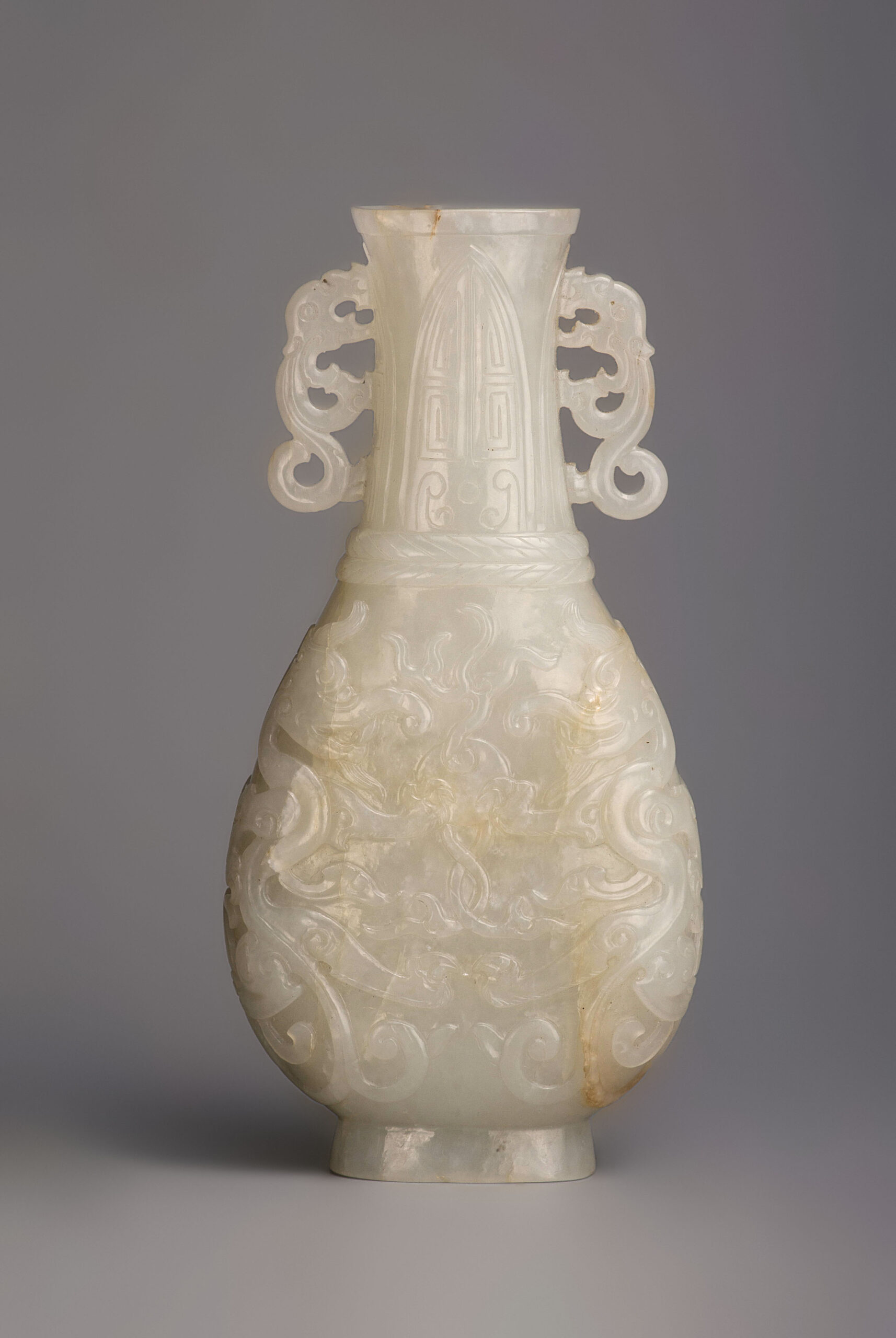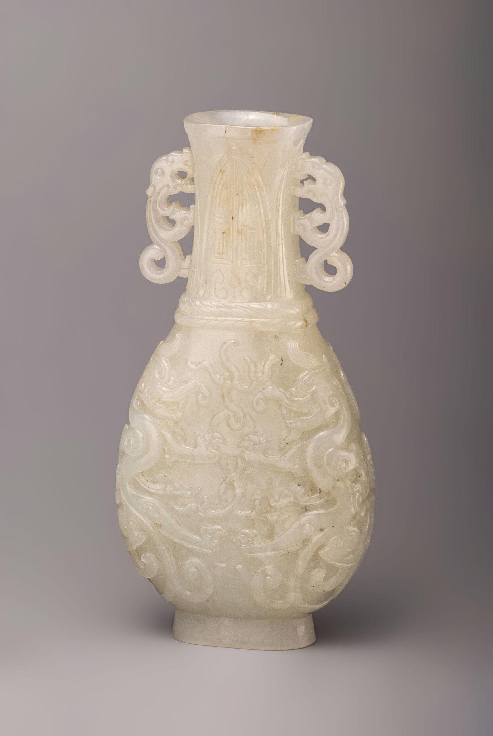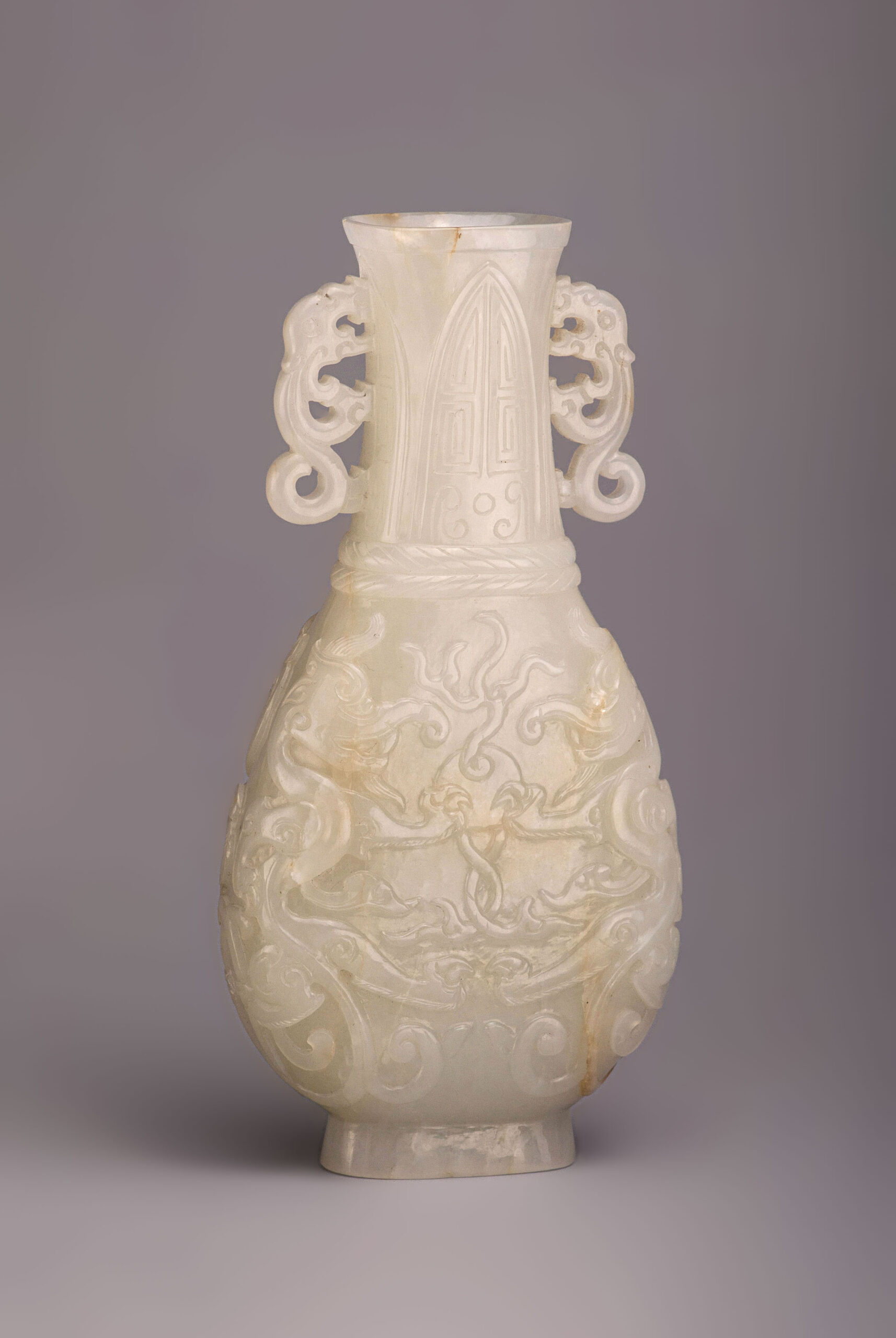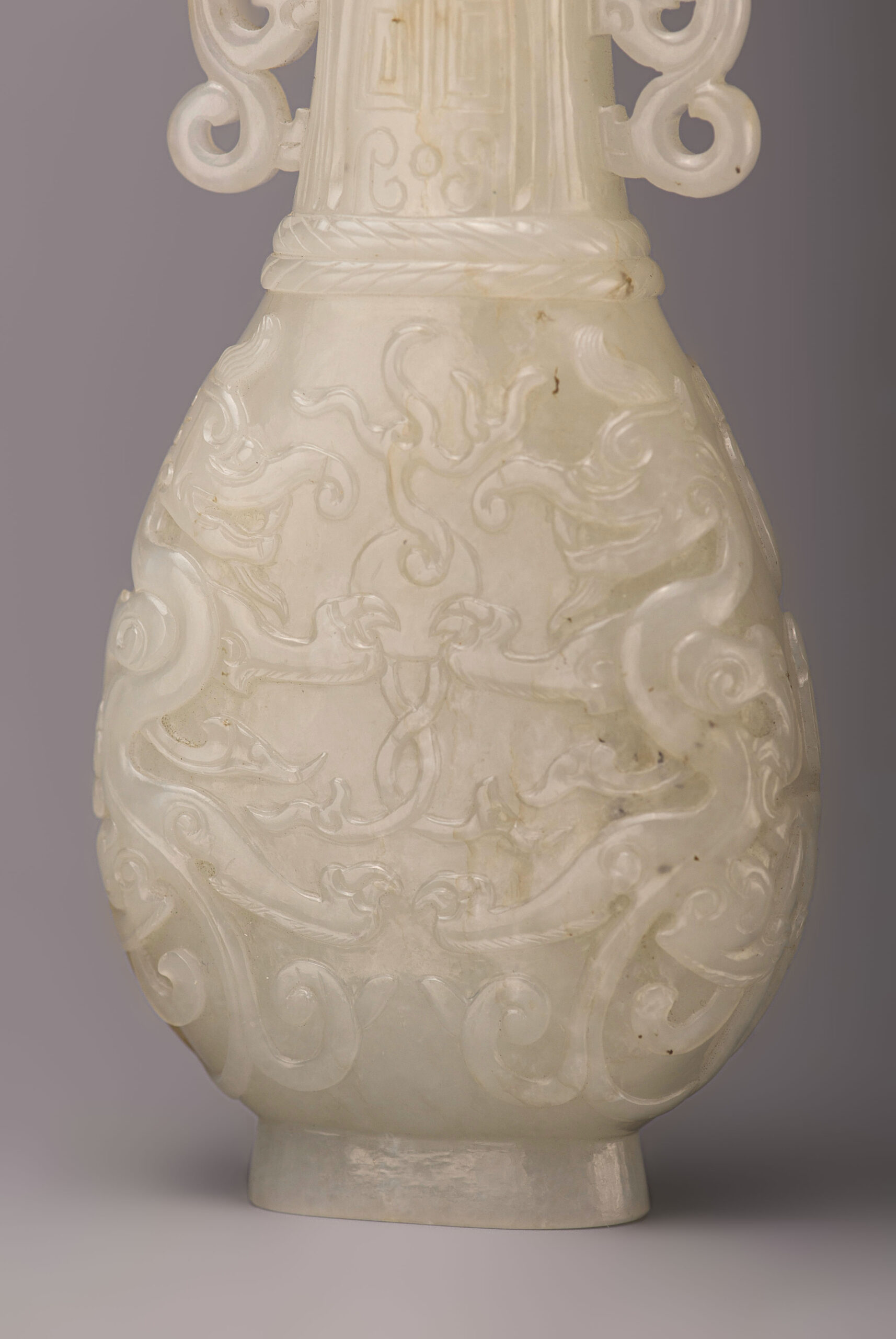 是器玉質潤透,白中帶青,琢扁瓶,瓶敞口,直頸,弧腹,圈足,雙螭龍耳。瓶身兩面紋飾相同,紋飾分兩段,以兩道弦紋區隔。瓶頸飾蕉葉紋,紋飾仿青銅器,古樸典雅。瓶身剔地浮雕雙龍搶珠,琢象鼻龍身軀蜿蜒升騰,張牙舞爪,氣勢凶猛,爪抓龍珠,絲毫不讓。整器雕琢工藝卓越,線條流暢,拋光打磨細緻,器質莊重古雅,盡顯皇家氣派。