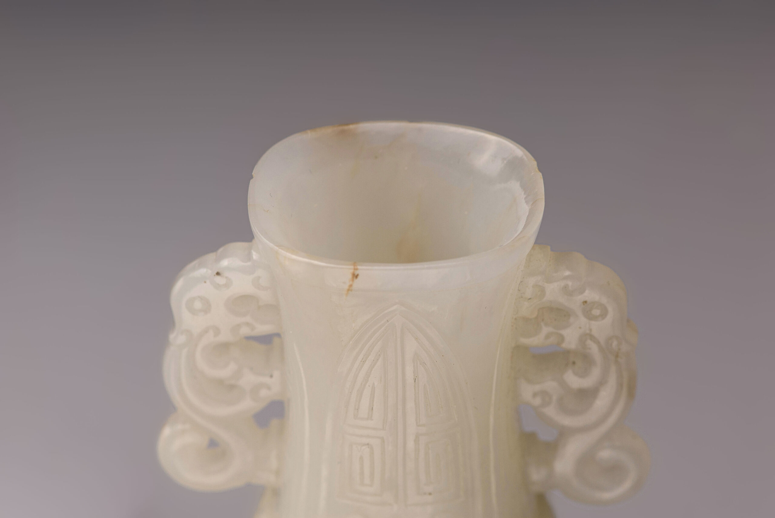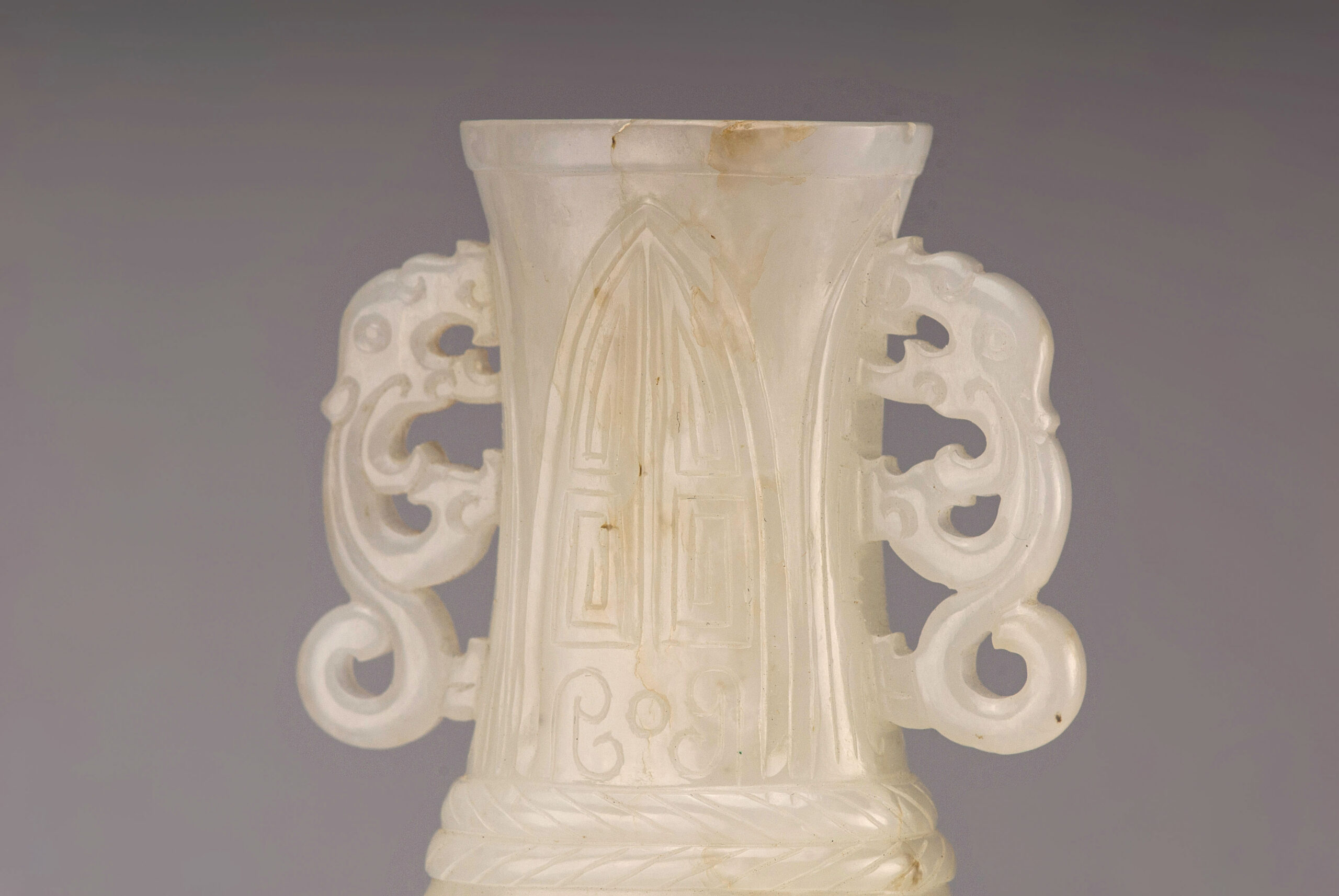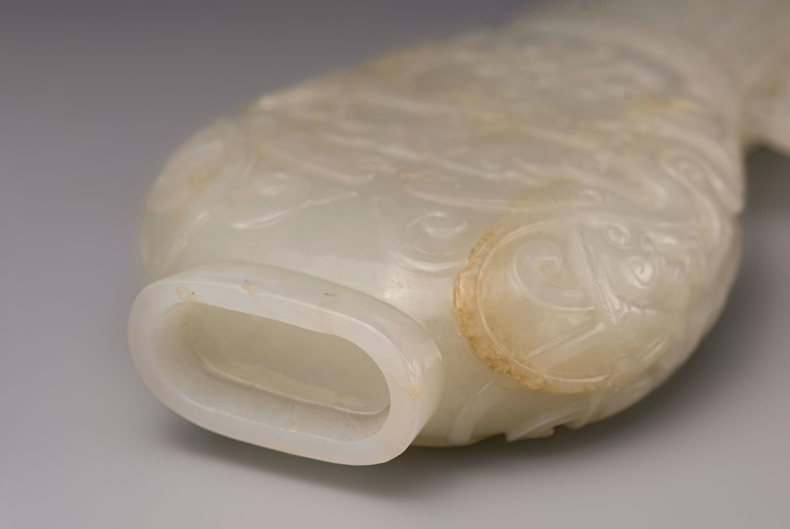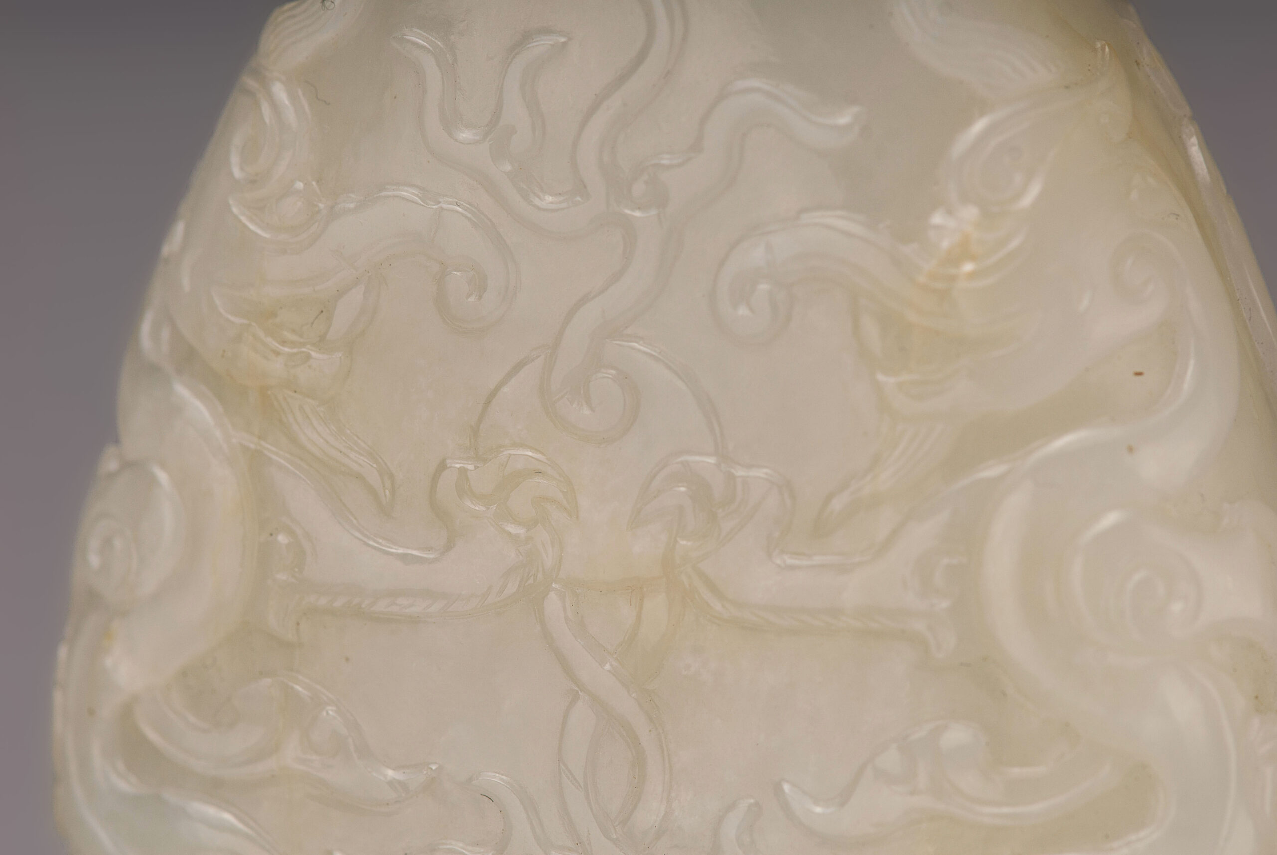是器玉質潤透,白中帶青,琢扁瓶,瓶敞口,直頸,弧腹,圈足,雙螭龍耳。瓶身兩面紋飾相同,紋飾分兩段,以兩道弦紋區隔。瓶頸飾蕉葉紋,紋飾仿青銅器,古樸典雅。瓶身剔地浮雕雙龍搶珠,琢象鼻龍身軀蜿蜒升騰,張牙舞爪,氣勢凶猛,爪抓龍珠,絲毫不讓。整器雕琢工藝卓越,線條流暢,拋光打磨細緻,器質莊重古雅,盡顯皇家氣派。