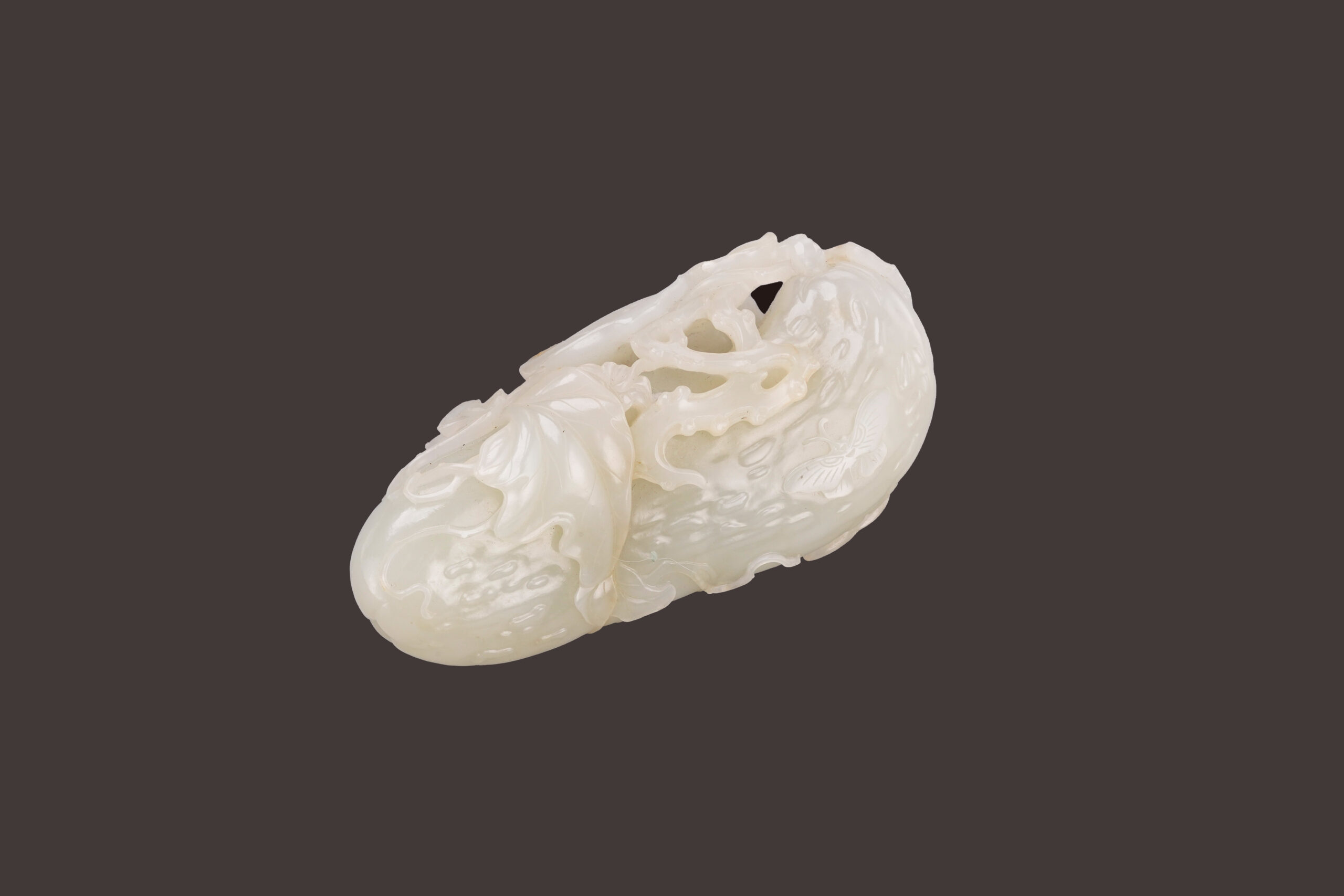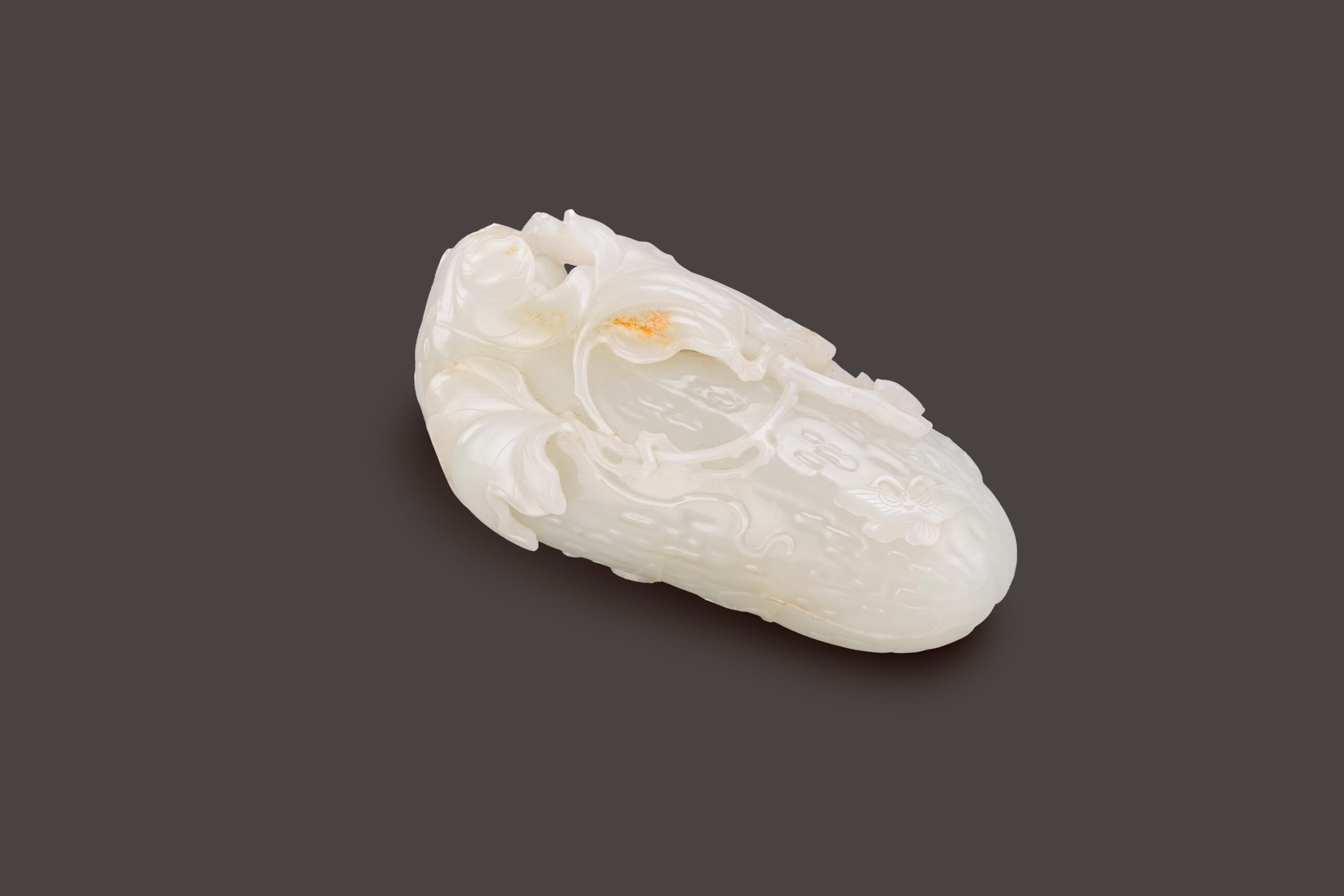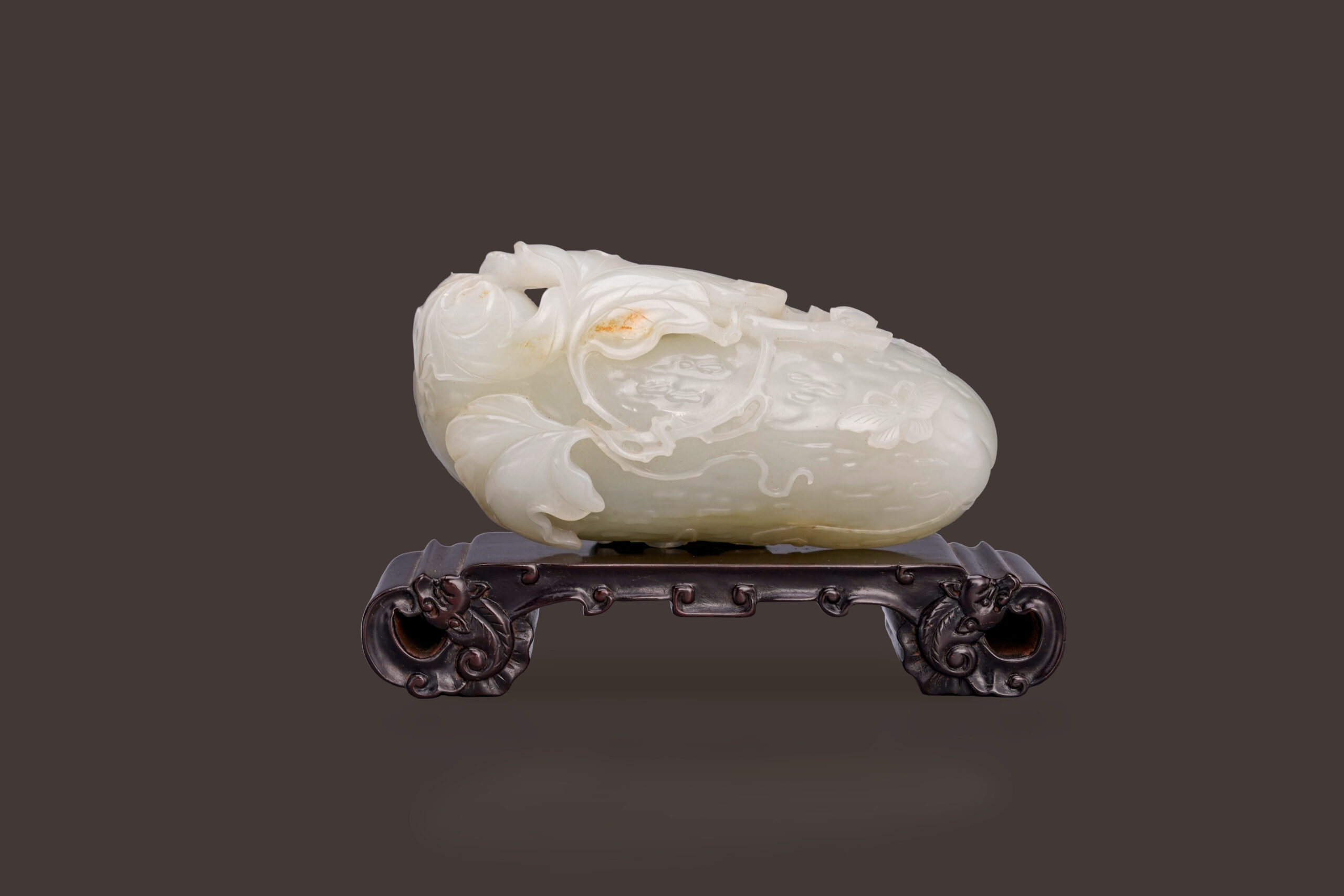 本件白玉錦荔枝,取質地細潤無瑕之白玉雕刻,拋光細潤一絲不苟,結合圓雕、鏤雕、浮雕等技法,寫實呈現錦荔枝多瘤、藤蔓蜿蜒舒展、枝葉柔軟極富生命力的造型,葉脈縷縷分明,匠人刻意局部提紅金皮色在葉子上,表現出葉子逐漸乾枯的意象,頗具匠心。錦荔枝兩側雕蝴蝶翩然飛至,翅膀花紋清晰寫實,瑩潤玉質更烘托蝴蝶輕盈身姿,格外雅緻,整件作品完美呈現瓜瓞綿綿的美好祝願。
