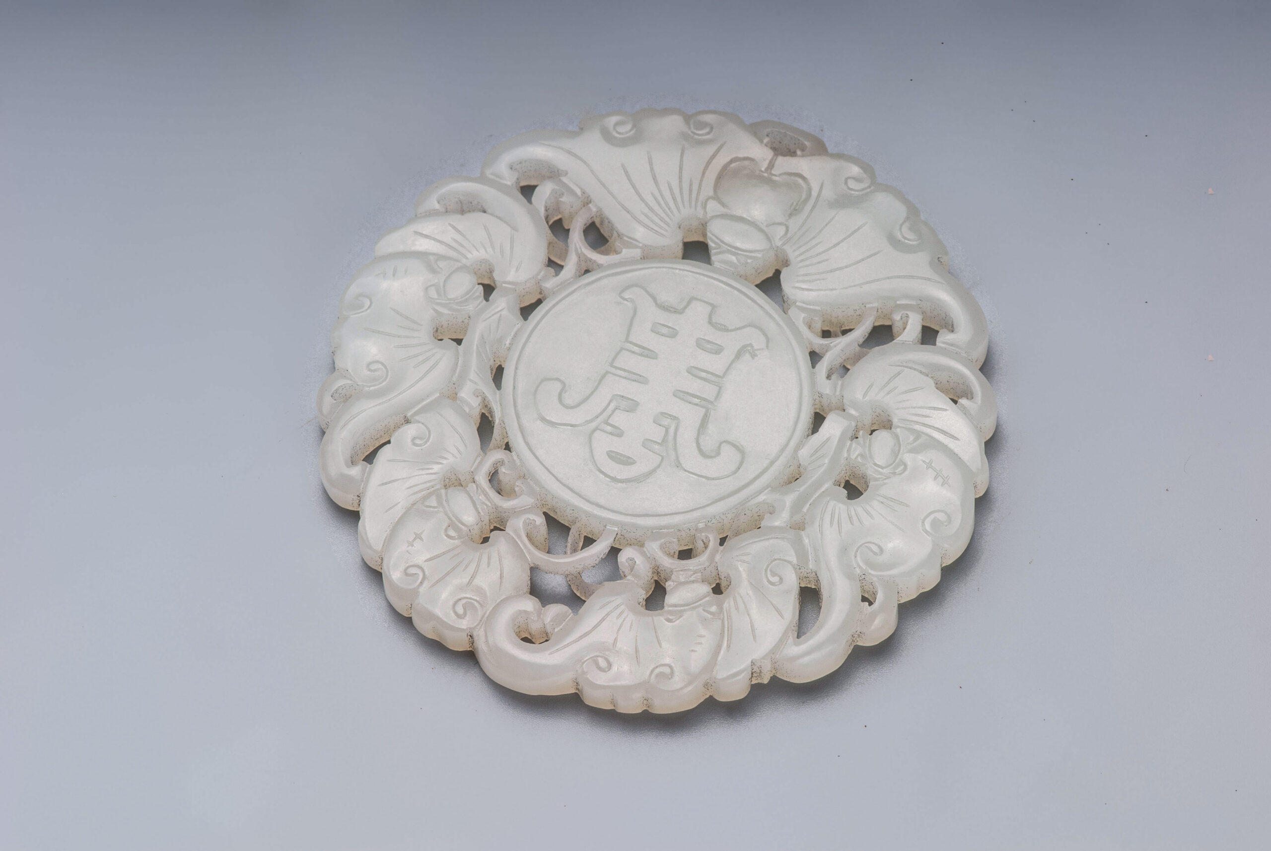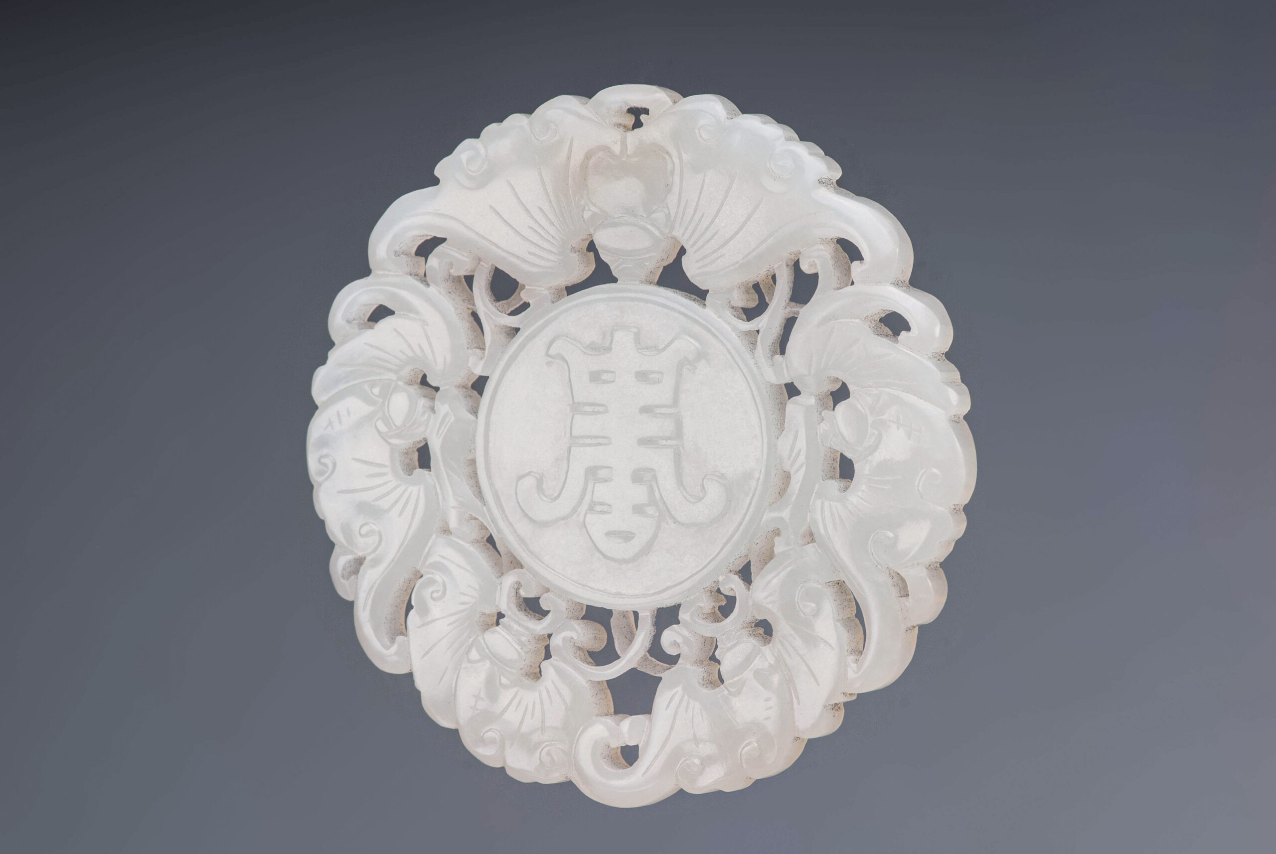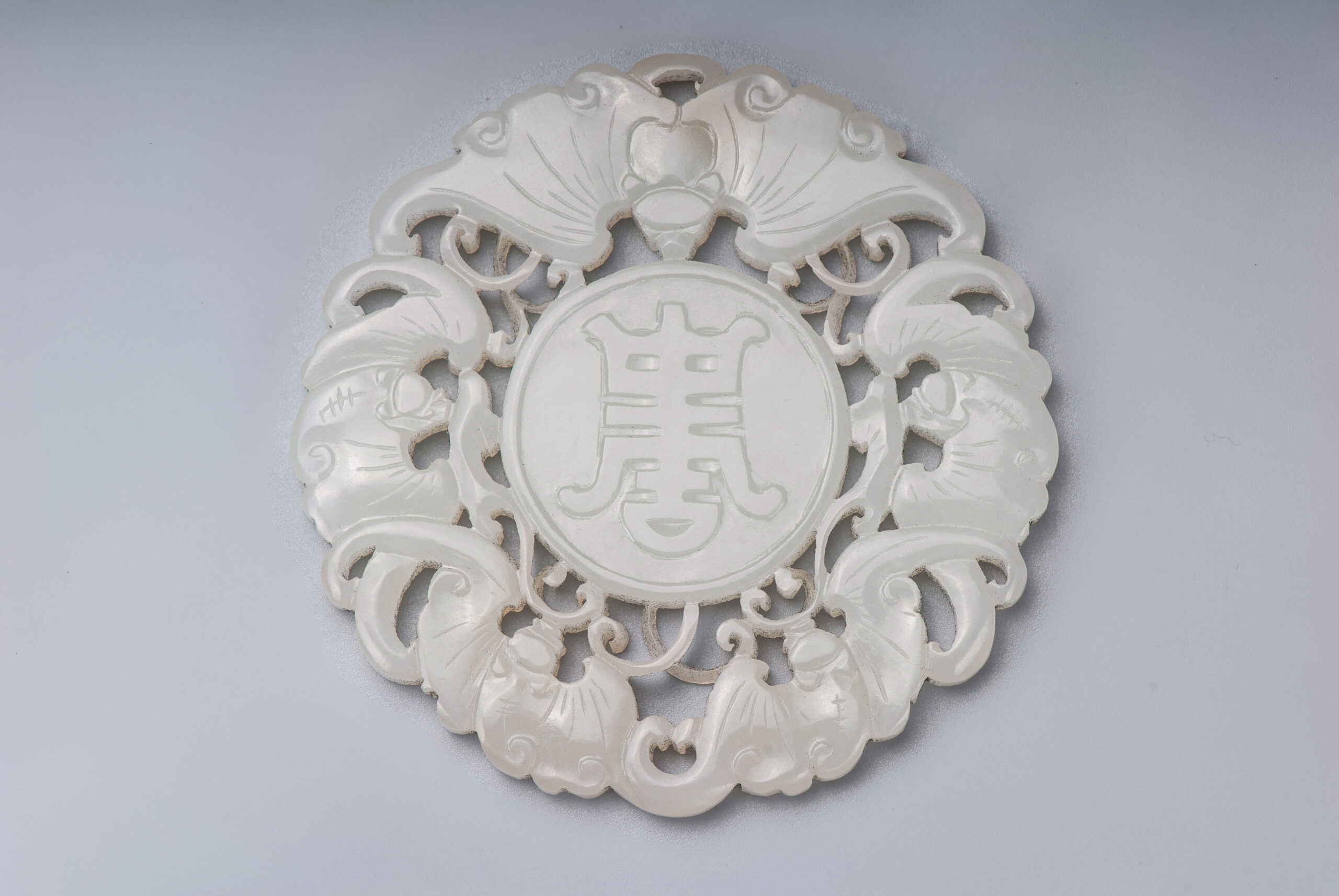 此珮質地瑩潤細膩,白皙無瑕,取上好玉材,結合多層次鏤雕、一面坡、剔地隱起等多種琢玉技法,琢五隻蝙蝠圍繞著一塊雕著壽字的圓璧。但見蝙蝠層疊圍繞,蝙蝠與壽字間亦鏤雕層次交錯的的如意卷雲紋,視覺感相當豐富。中央圓璧以剔地隱起刻紋壽字紋,線條流暢,莊重典雅。整器拋光細膩,琢玉工藝精湛,視覺感豐富的裝飾雕刻工藝與莊重典雅氣質並存,是極為巧妙之作。