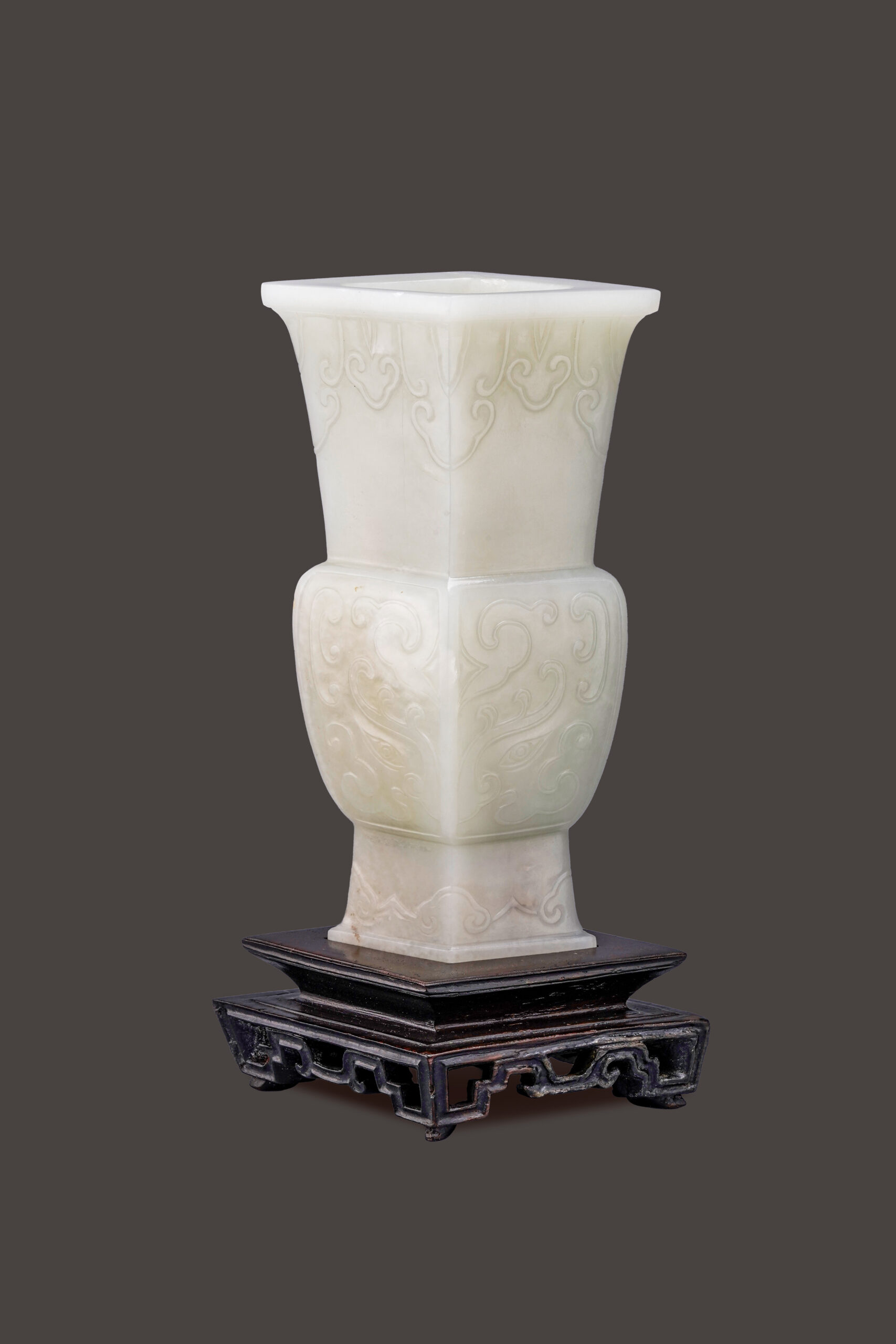 本件取潤白玉石雕琢,器身修長,口與足均呈菱形喇叭口,上琢蕉葉紋,下琢如意紋。腹部以雙鉤陰線壓地技法琢獸面紋,獸面紋臣字眼,眼尾上飄,如意鼻,雙角如鹿角型,整體仿青銅器獸面紋飾,器質莊重古樸,線條刻畫流暢,打磨光潤,比例完美,製作精良,是為秀美典雅之陳設佳器。