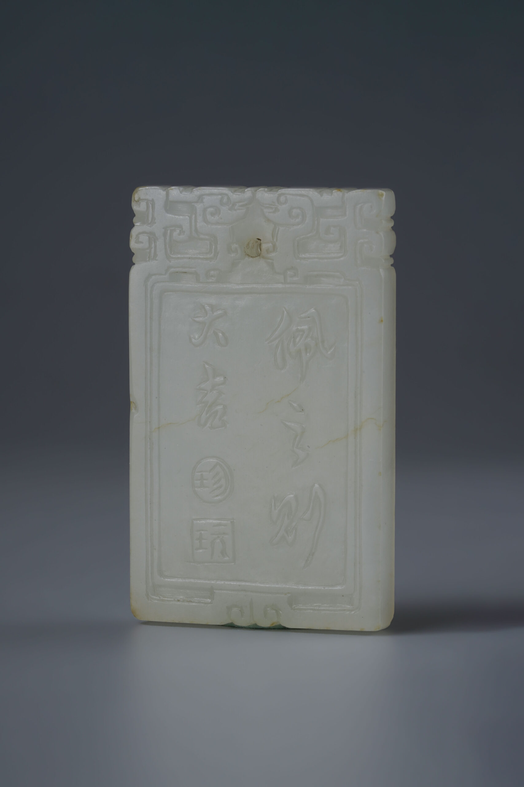 此珮白玉質,質地潤澤瑩亮,白皙細緻。琢夔龍紋為邊,兩面打磨平整光潔,一面剔地淺浮雕狻猊,狻猊蹲坐,口吐如意祥雲,造型生動古雅。另一面刻「佩之則大吉」,字體飄逸灑脫,文後刻「珍」「玩」二字款。狻猊為龍生九子之一,喜煙好坐,其形象常出現在銅爐、佛教坐騎中,以之為珮甚為少見。