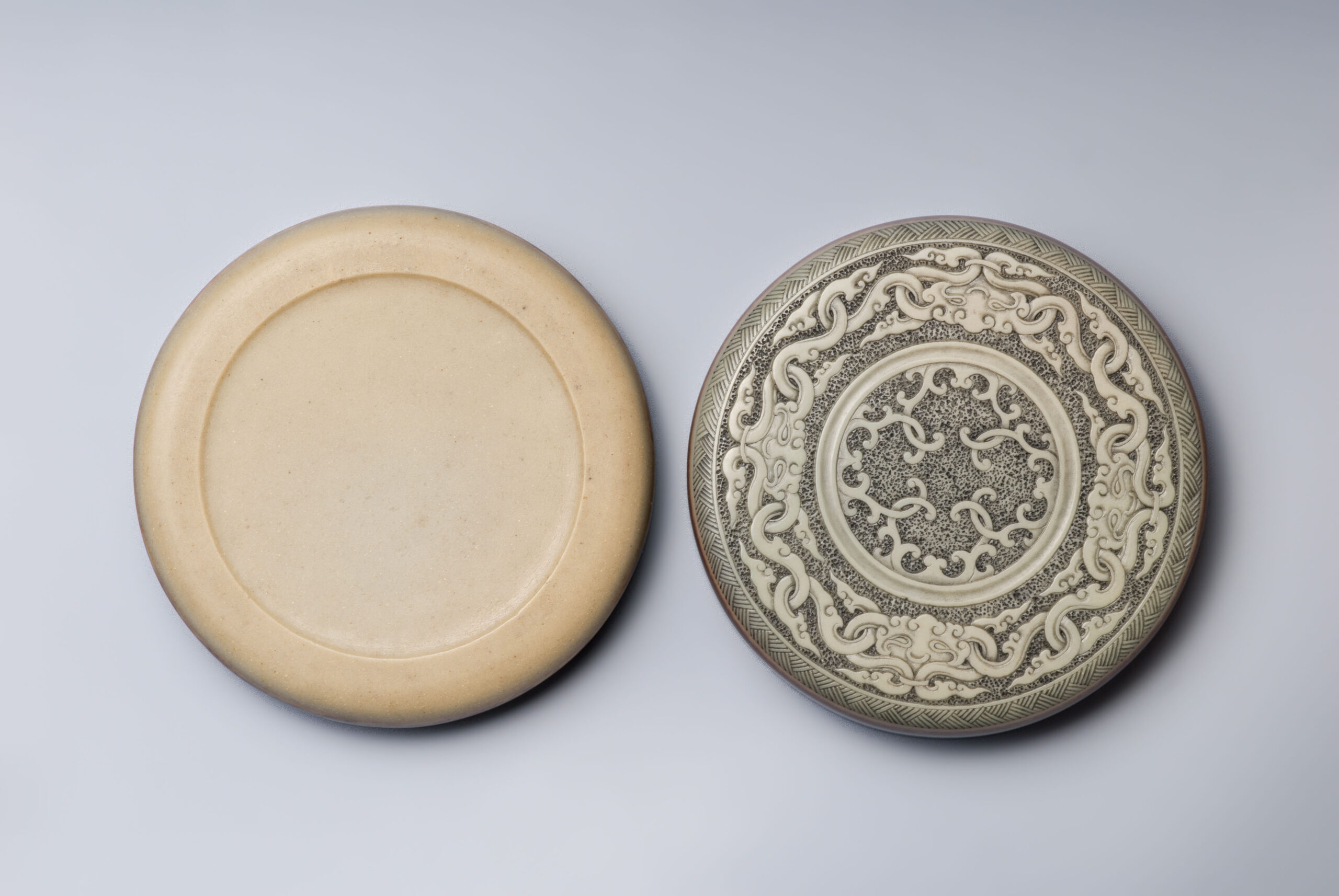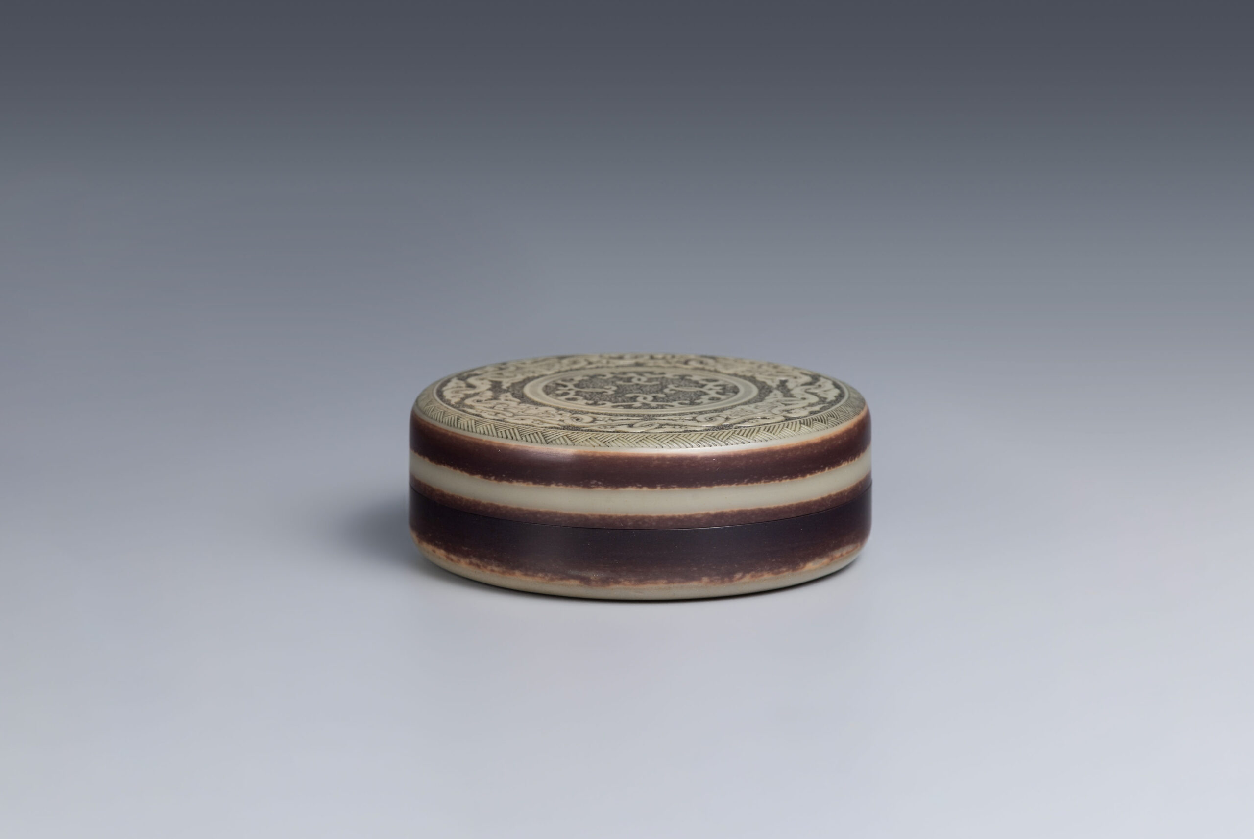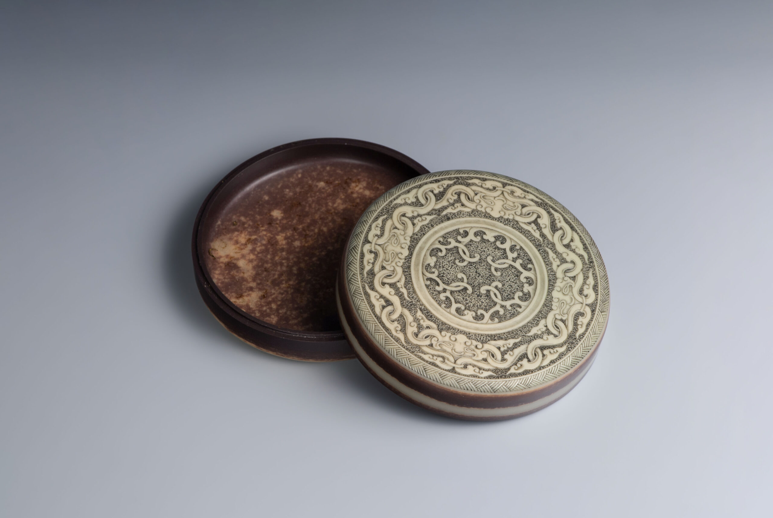 本件香盒以祁陽石刻製,做扁圓盒型,子母口。盒蓋蓋面呈現青綠色,蓋牆呈現深紫、青綠、深紫三層帶狀顏色,如玉帶纏腰般貴氣。蓋面紋飾分三層,蓋沿刻曲直紋,外圈淺浮雕獸面雲紋,內圈淺浮雕勾連雲紋,內外圈之間刻弦紋區隔。蓋面紋飾線條婉轉流暢,饒富古意。盒身器壁色深紫,底色青綠,器底淺挖內凹做圈足。本件器形規整,氣質古雅,可為珍稀之品。