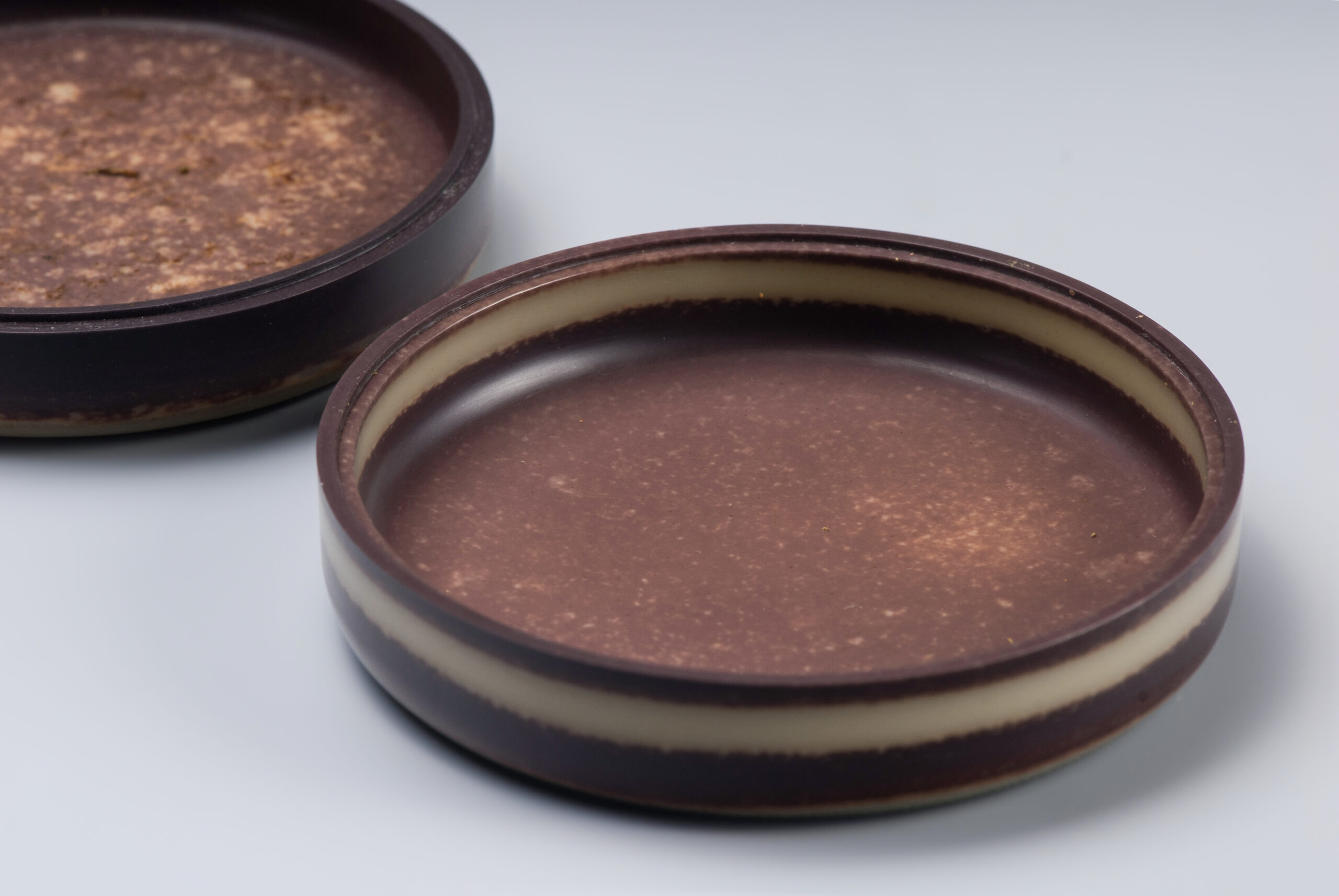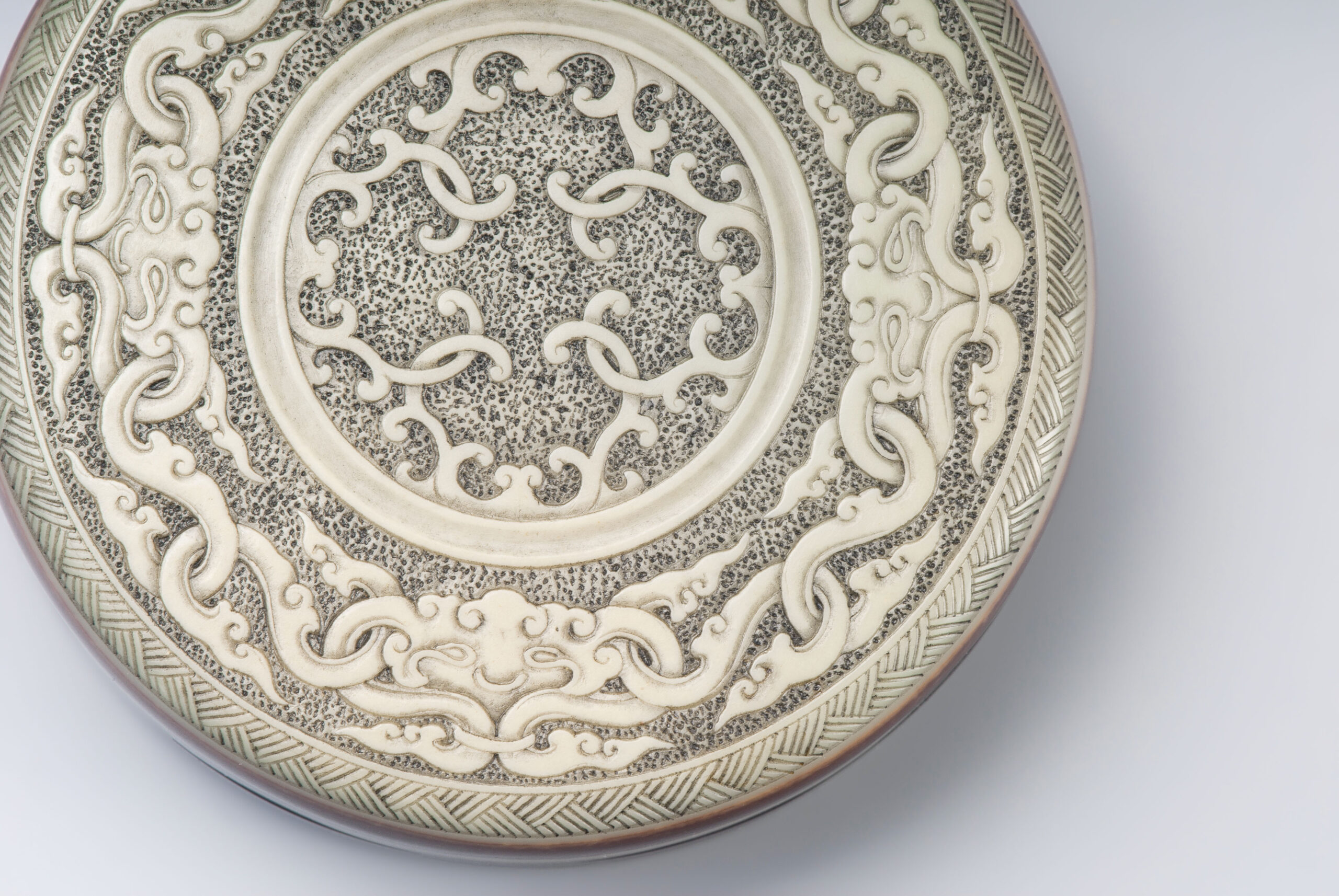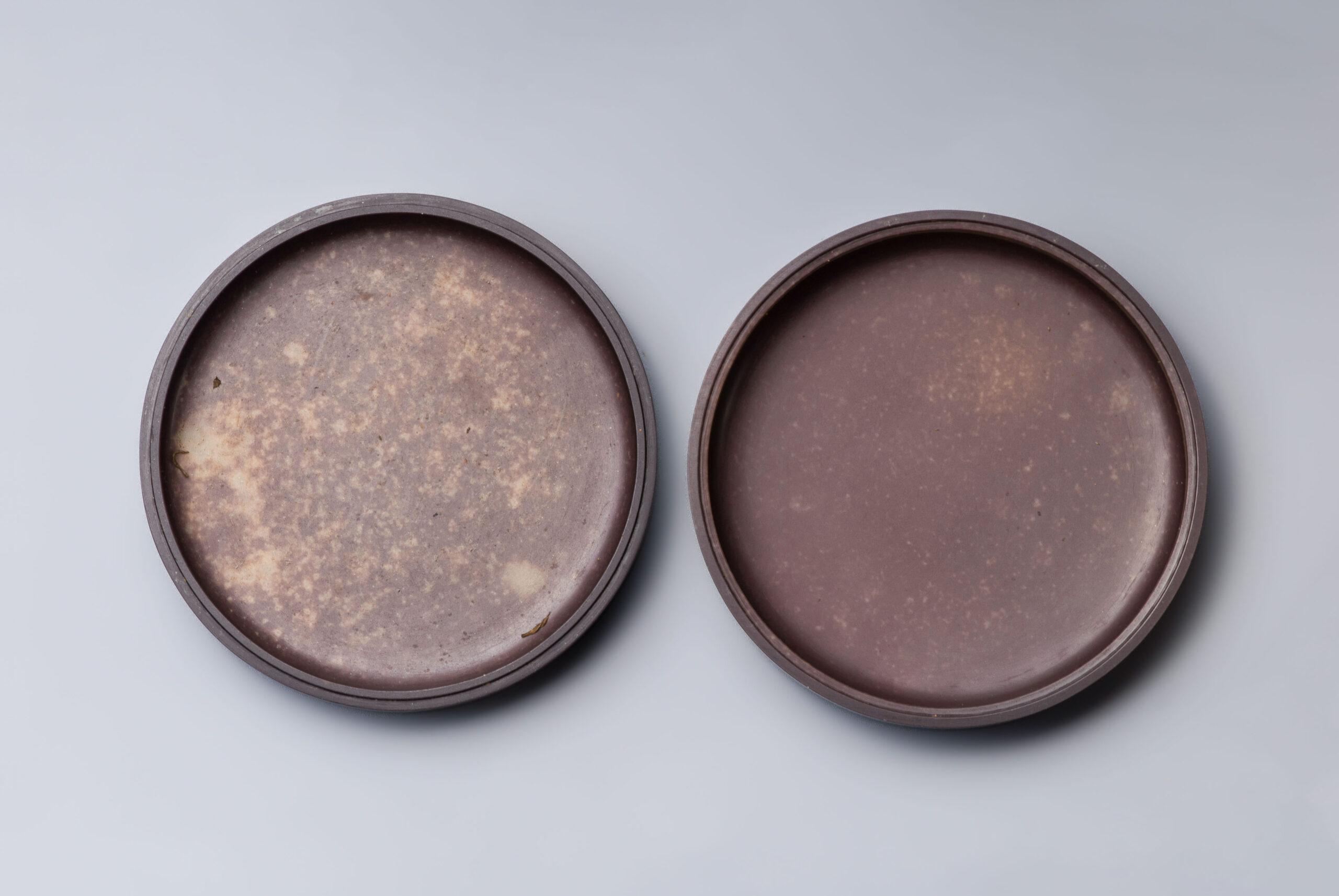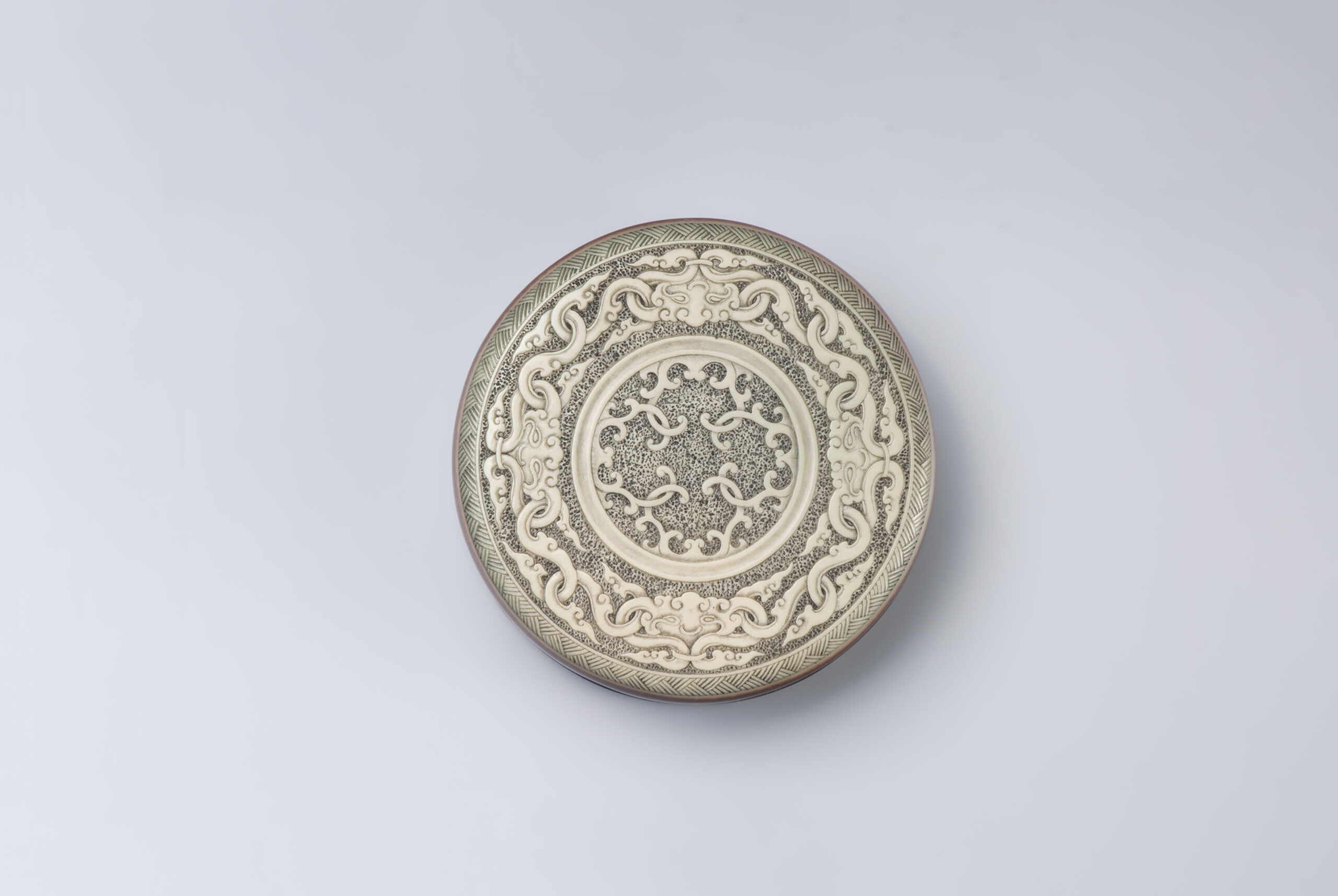 本件香盒以祁陽石刻製,做扁圓盒型,子母口。盒蓋蓋面呈現青綠色,蓋牆呈現深紫、青綠、深紫三層帶狀顏色,如玉帶纏腰般貴氣。蓋面紋飾分三層,蓋沿刻曲直紋,外圈淺浮雕獸面雲紋,內圈淺浮雕勾連雲紋,內外圈之間刻弦紋區隔。蓋面紋飾線條婉轉流暢,饒富古意。盒身器壁色深紫,底色青綠,器底淺挖內凹做圈足。本件器形規整,氣質古雅,可為珍稀之品。