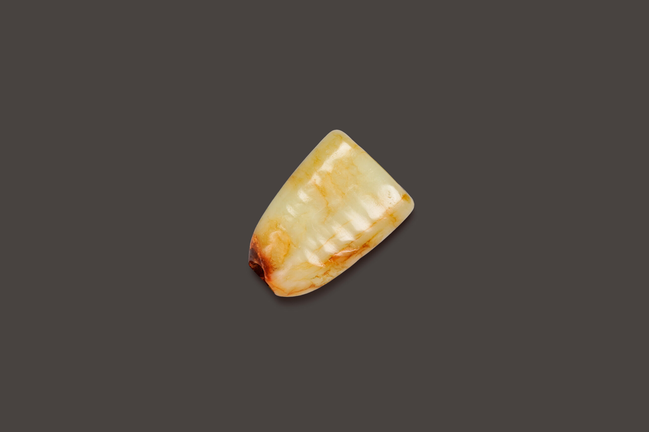此珮以帶沁黃玉雕就,久經盤玩摩挲,包漿如凝脂般潤澤。其頭尾穿孔繫繩,僅以簡單線條刻畫意象,狀若蟬形。《屈原列傳》:「蟬蛻於濁穢,以浮游塵埃之外,不獲世之滋垢」,古人喜以玉蟬為珮,取蟬性高潔,如蓮般出淤泥而不染之意,後世更取其諧音,而有「腰纏萬貫」、「金枝玉葉」、「一鳴驚人」等吉祥寓意。